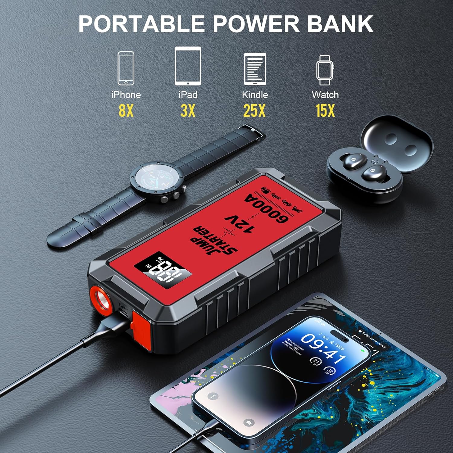 - 【Portable Charger and LED Flashlight 】The Car Jump Starter Built-In Led Flashlight, Provides Illumination In Low-Light Conditions Or Roadside Emergencies.Also Doubles As A Portable Power Bank To Charge Phones, Tablets, And Other Usb Devices On-The-Go.