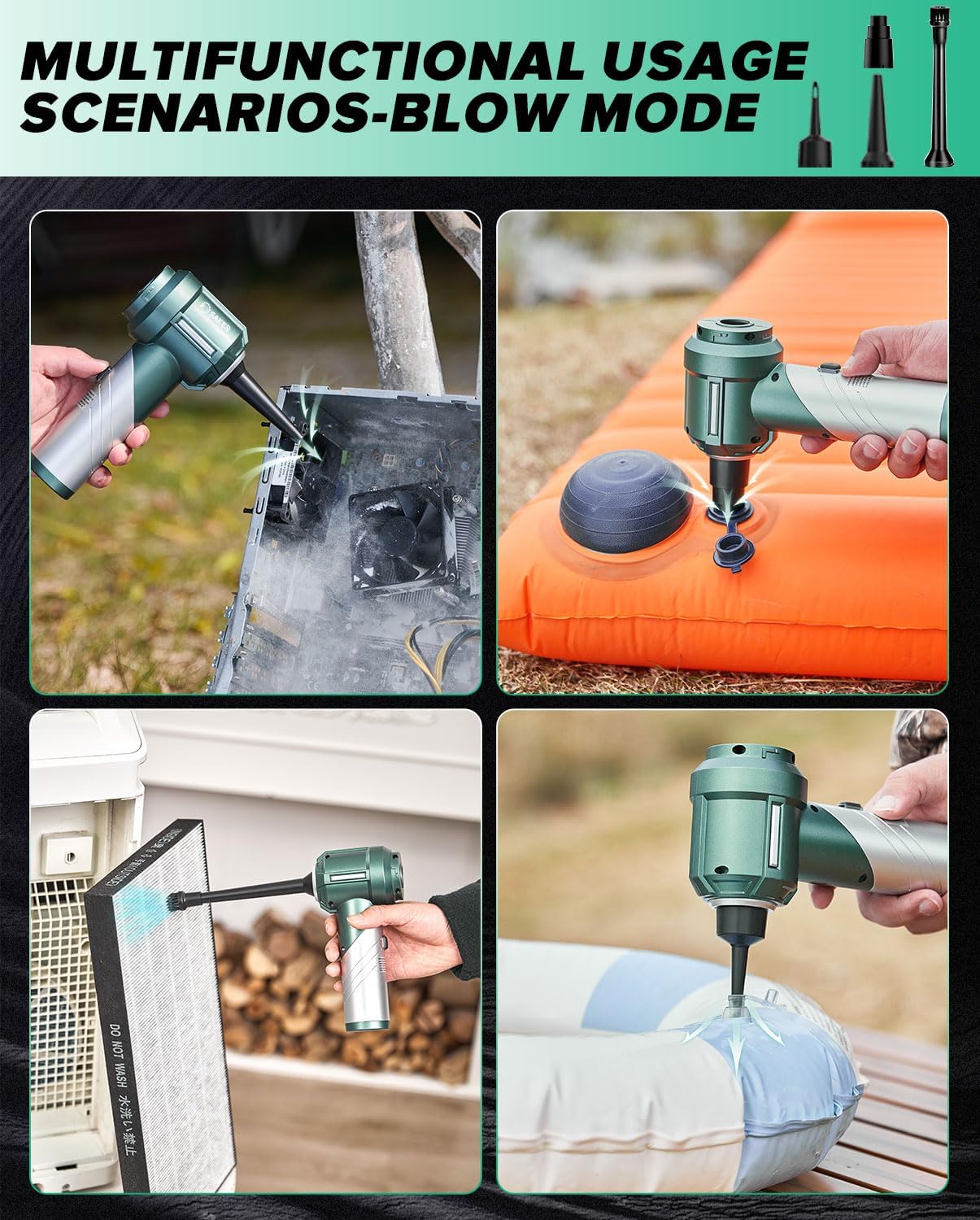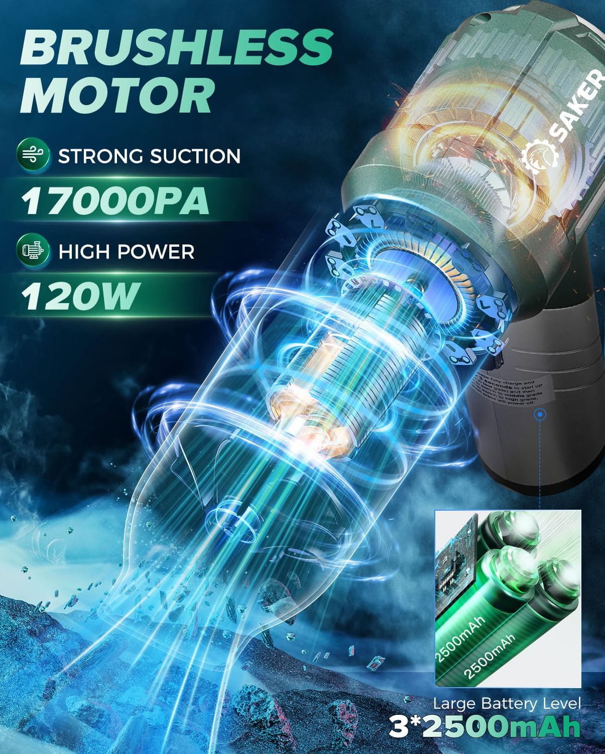 - 【3-in-1 multifunctional mini vacuum cleaner】Saker 3 in 1 Handheld Car Vacuum Cleaner is equipped with various accessories to meet the needs of blowing, sucking, and vacuuming in various scenarios. It can not only blow away garbage and dust from computer keyboards, cars, etc., but also suck up residual garbage or hair from tables, floors, hair, etc. The inflation nozzle can inflate balloons, swimming rings, etc. Rich accessories can make your life more convenient.