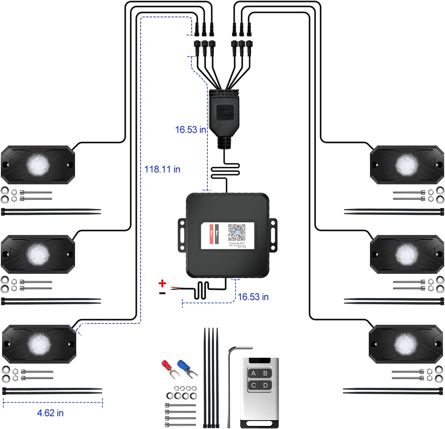 - 𝐏𝐥𝐮𝐠-𝐚𝐧𝐝-𝐏𝐥𝐚𝐲 𝐈𝐧𝐬𝐭𝐚𝐥𝐥𝐚𝐭𝐢𝐨𝐧: The LED rock lights for UTV adopts a plug-and-play design with a rubber cap to securely lock the connection, eliminating worries about disconnection from pulling. The pins are perfectly matched, so you don’t have to worry about damaging them during connection