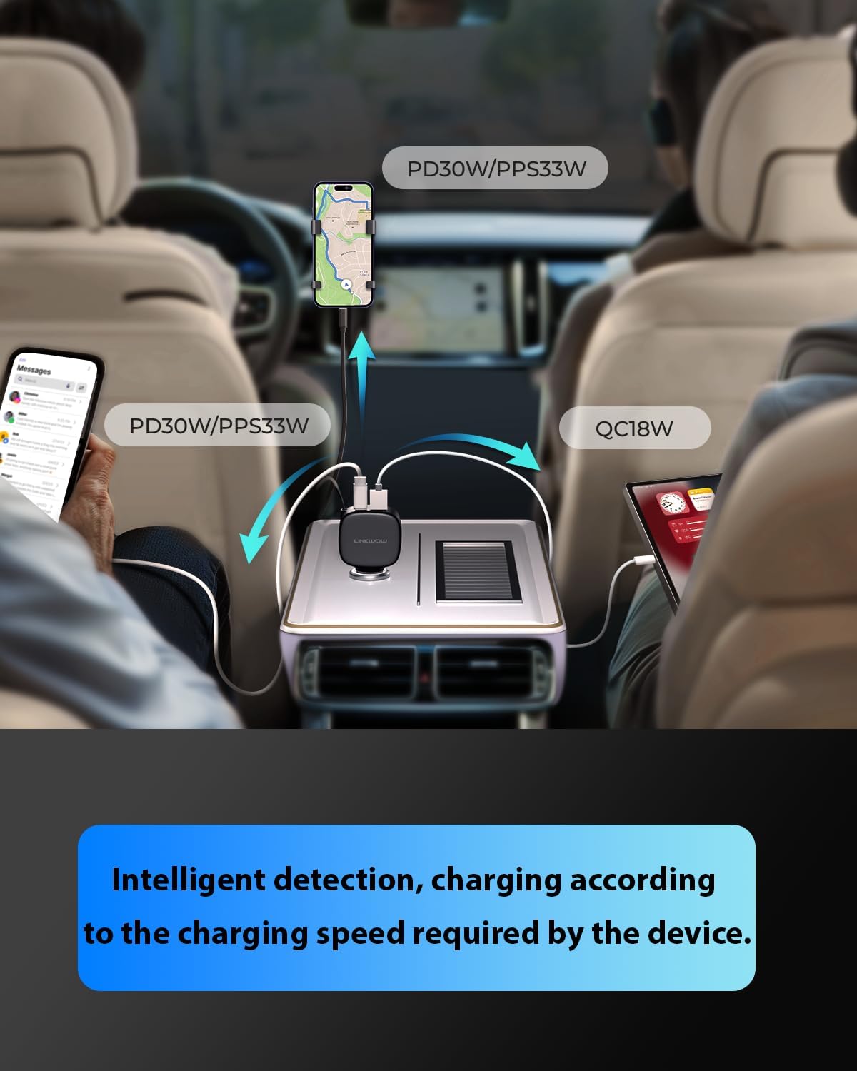 - 【Must-Have Car Charger for Family Road Trips】 Triple-Device Fast Charging: Powers action cameras via retractable Type-C cable while dual USB ports simultaneously charge parents' phones and kids' tablets.Smart Adaptive Charging: Auto-detects Apple/Samsung devices and intelligently selects optimal PD/QC fast charging protocol.Universal Device Compatibility: Fully supports Type-C car fast charging and iPhone car flash charging, compatible with laptops, smartphones and tablets.