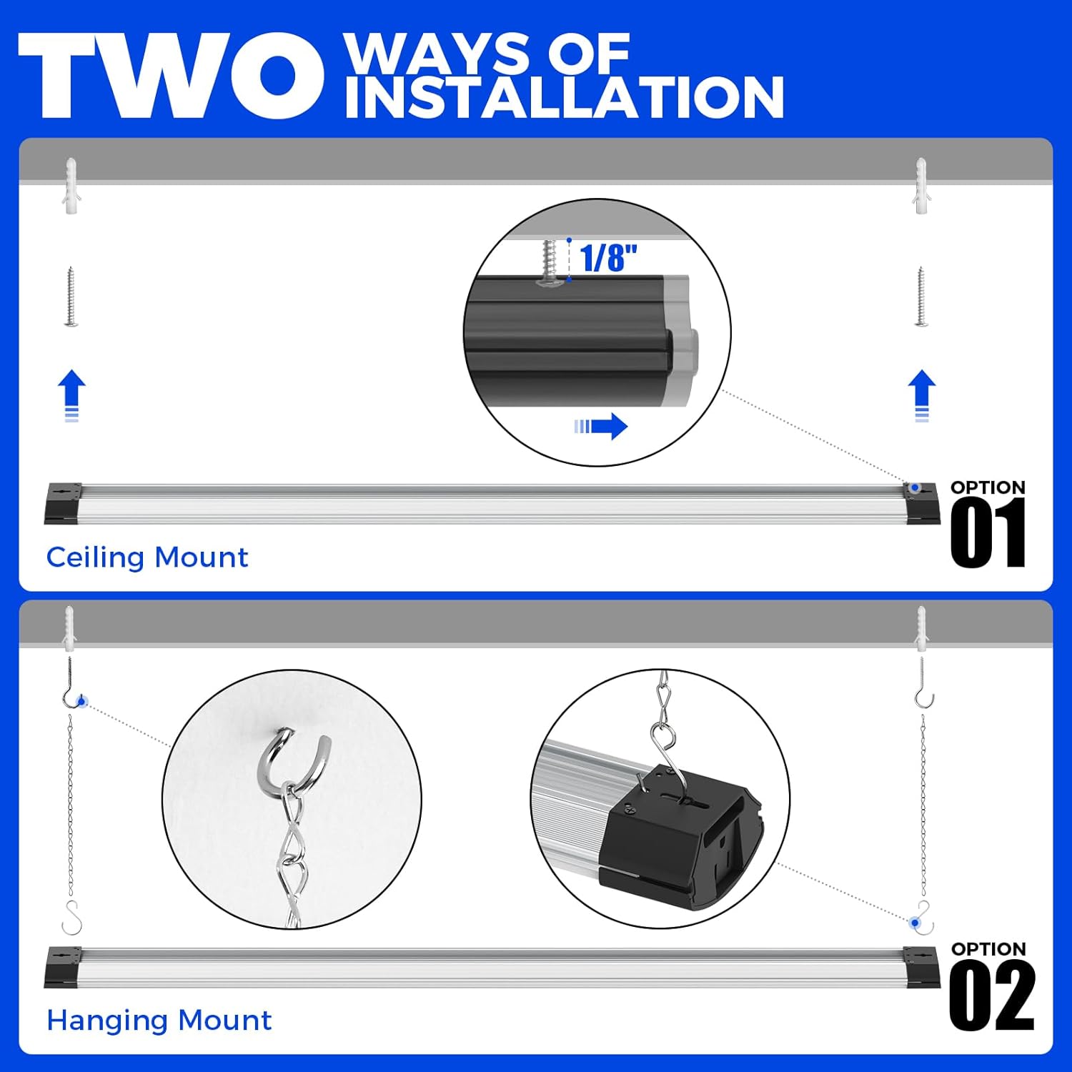 - Easy Installation: Plug in with a 59" power cord. You can hang LED garage lights with the included hanging chain or mount it directly to the ceiling with the included mounting screws