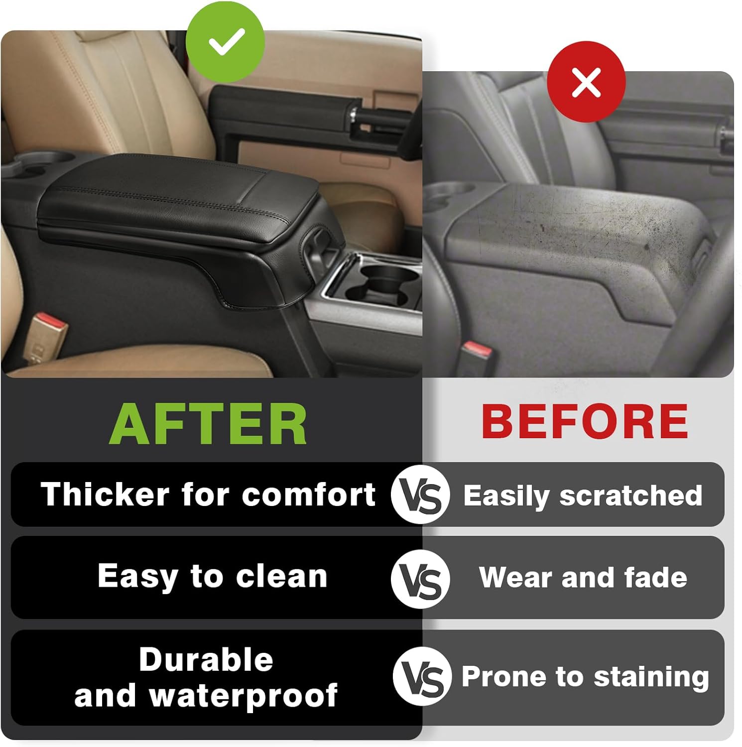 - Unique Design: Designed according to the OEM element to make it match your vehicle perfectly and even better. Our armrest cover is crafted with high-quality Vegan Leather, which is skin-friendly, breathable and soft.