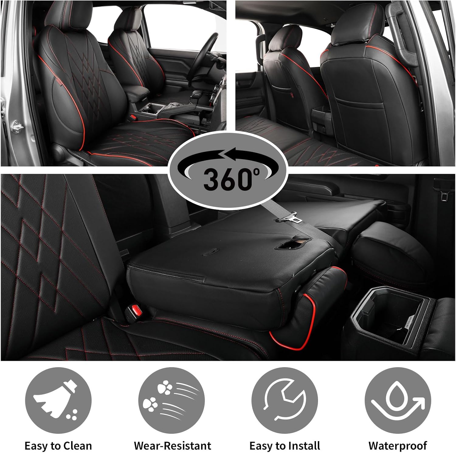 EKR Tacoma Car Seat Covers Custom for Select Toyota Tacoma (Only for Hybrid) 2024 2025 Double cab TRD Sport,TRD Off-Road,Limited,Trailhunter - Full Set,Leather(Black with Red Trim)