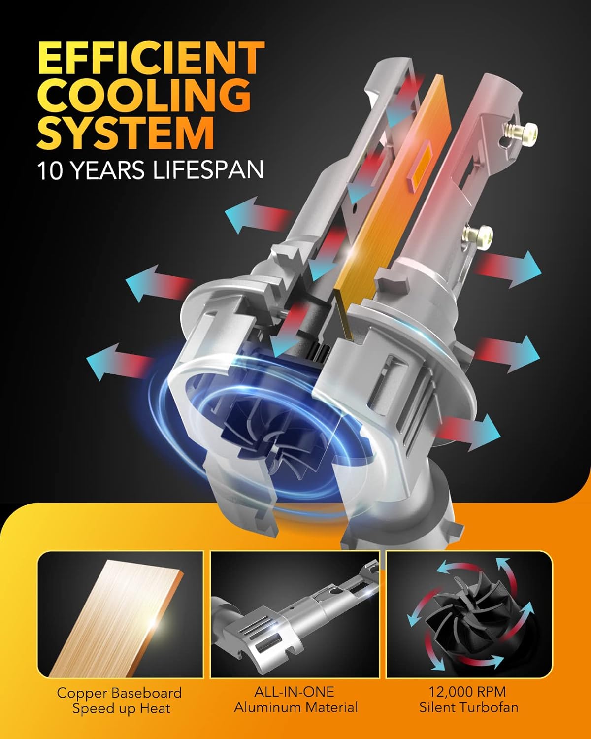 - 10+ Years Longer Lifespan: Invest in the longevity of your vehicle's lighting system with OXILAM H11 9005 light bulbs. The full aviation aluminum body, copper baseboard, and built-in 12,000RPM silent cooling fan ensure fast and stable heat dissipation, maximizing the lifetime and brightness of these bulbs. With a lifespan of up to 10 years, you can enjoy reliable and consistent lighting performance, even with daily use