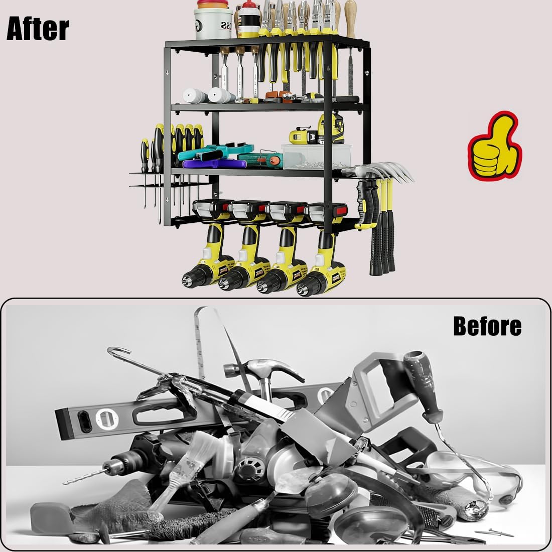 - Large Size: Your ultimate tool mate! 4 drill slots + 3-tier shelves & dual hooks organize all tools in one spot. Never waste time searching – enjoy a clean workspace that boosts efficiency!