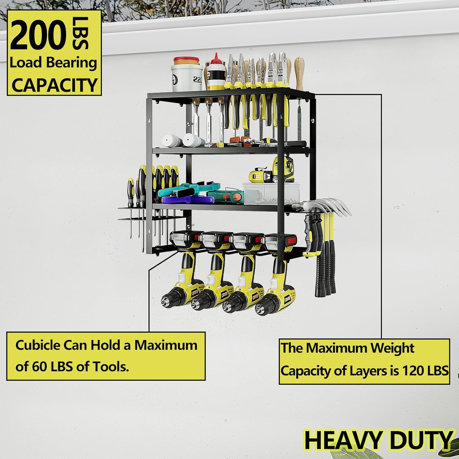 - Durable: This 4-layer tool storage rack is made of high-strength compact metal, with stronger load-bearing capacity and durability. Our tool storage rack has been extensively tested to bear up to 200 pounds.