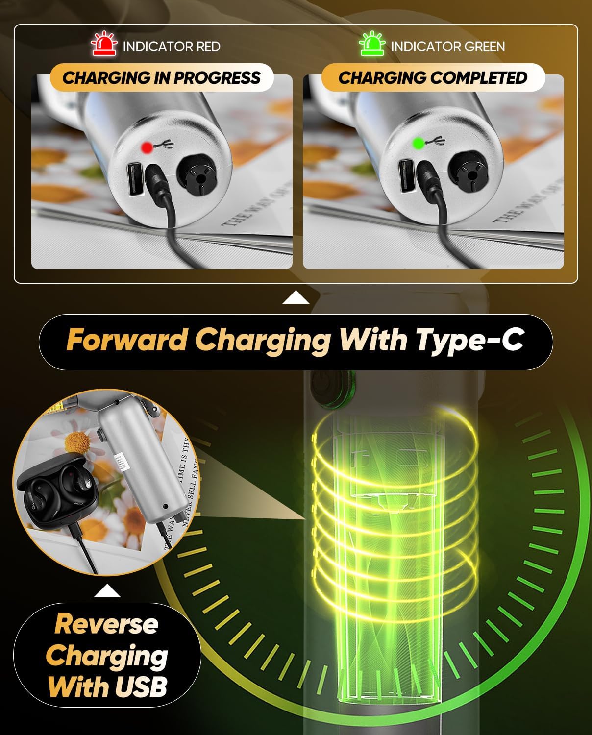 - 【Two Different Charging Interfaces】The Saker car vacuum portable cordless is equipped with a built-in 3 * 2600mAH battery, which is rechargeable and reusable, making it more environmentally friendly and energy-efficient. The 6-in-1 car vacuum cleaner has two different charging ports. One uses a Type-C data cable to charge the vacuum cleaner, and the green indicator light can promptly remind you that the battery is fully charged. A USB charging cable that can be plugged in to connect the other end to a device that needs to be charged, such as a phone, tablet, etc.