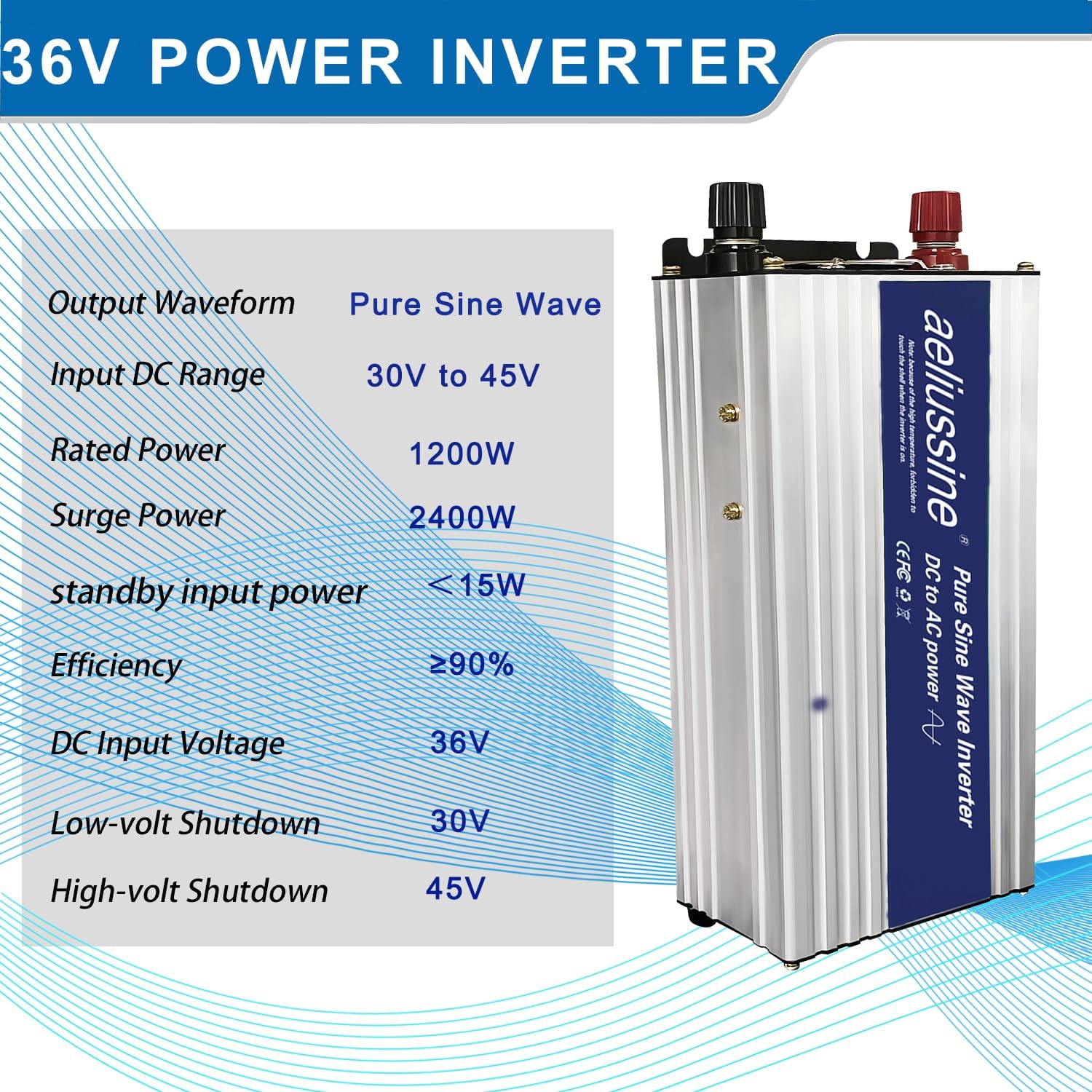 - pure sine wave inverter:Smooth and perfect sine waveform, just the same as home power/city power, Provide max 1200 watt continuous power and 2400 watt peak power at 60Hz frequency, power your 110v 120v ac appliance with a 36v power battery bank (battery voltage 30v to 48v is acceptable)