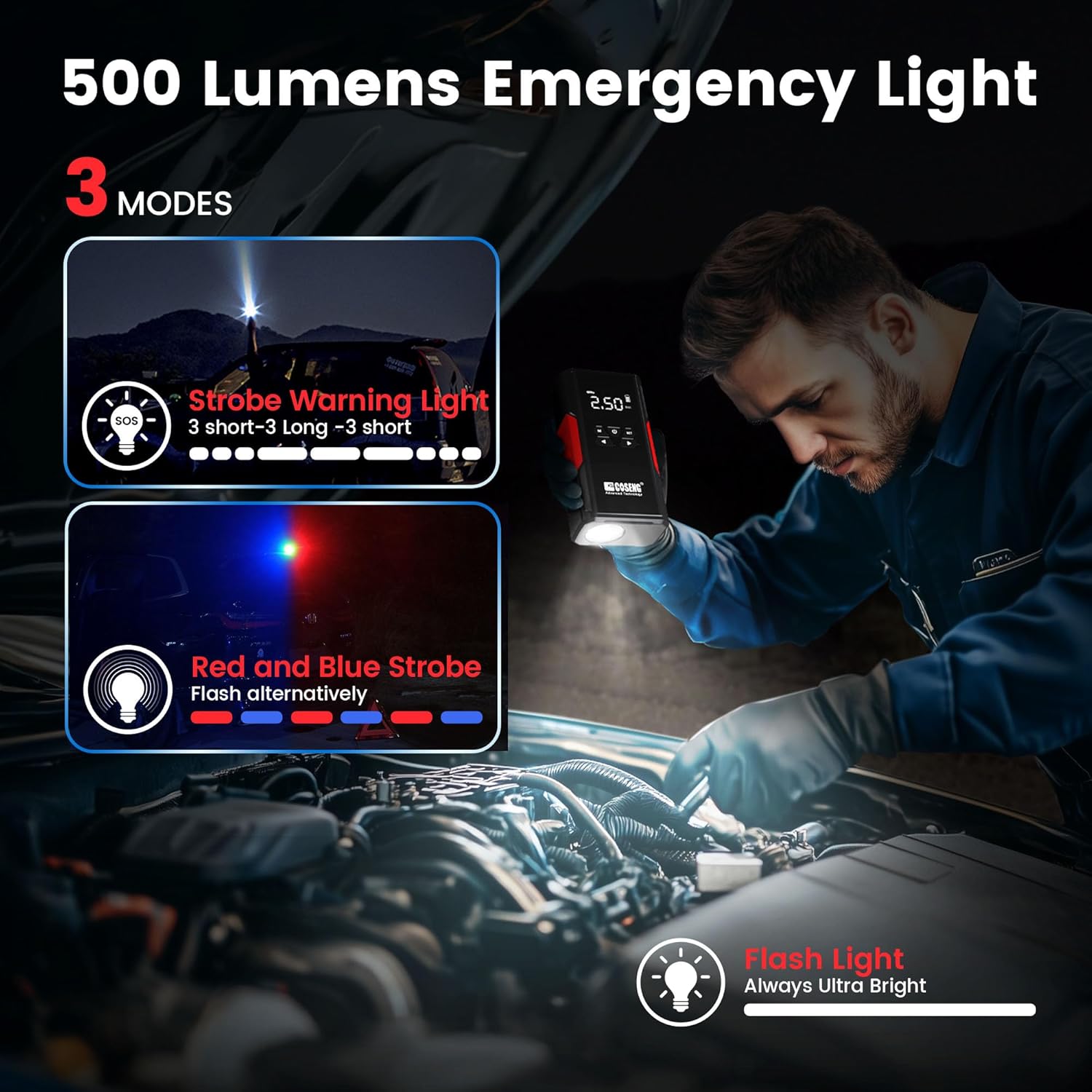 - 500-LUMEN LED LIGHT WITH 3 MODES: This portable car starter features a 500-lumen LED lamp that can illuminate continuously for up to 72 hours. It offers three lighting modes (flashlight / SOS white strobe / red-blue strobe) to handle different emergencies and can serve as a warning triangle for enhanced road safety.