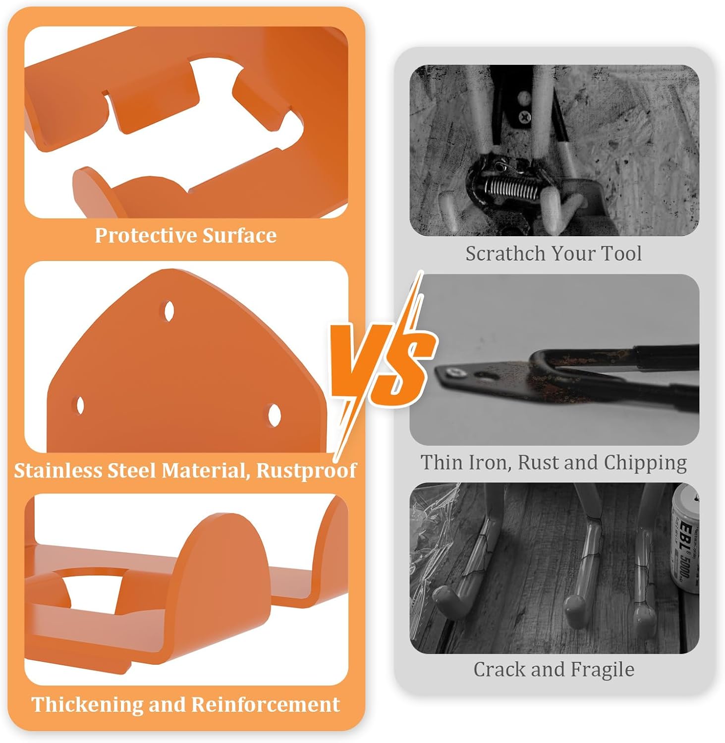 - Sturdy and Premium Materials: The weed eater hanger is made of thickened stainless steel, which is stronger and has high bearing capacity. The surface of the racks is sprayed with orange paint for double protection. Its robust design ensures that your power tools are held securely in place, preventing accidental damage or falls, so you can trust it to keep your tools safe