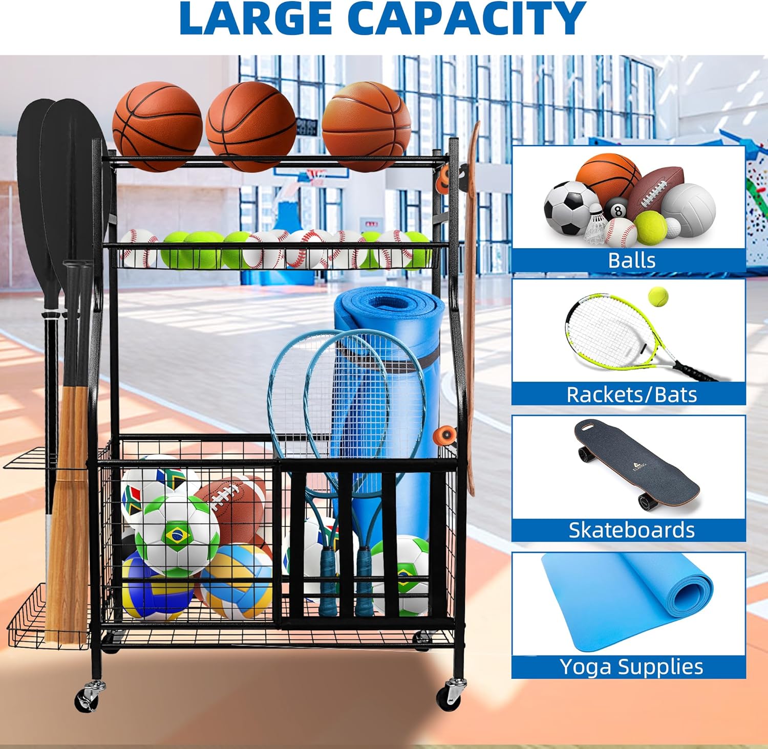 - [PREMIUM MATERIAL] Our garage sports equipment organizer combine with 2 big storage bin and 2 tier baskets with 4 removable encryption wire mesh baskets, side separable bat rack. The large capatity storage bin can holds basketballs, footballs, soccer balls, volleyball, helmets, and even your kids toys.Organize all your indoor & outdoor sports goods on one basket for truly space saving and providing easy access