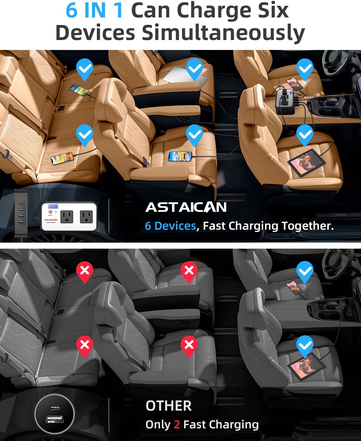 - 【Astaican 200W Car Power Inverter】The 6 in 1 car inverter can convert 12V DC to 110V AC power, equipped with PD 20W USB-C and 18W USB QC port, dual USB ports and AC outlet. One car charger for most your USB A & USB C devices, compatible with Phone, laptop, power bank, smart watch, tablet, lights