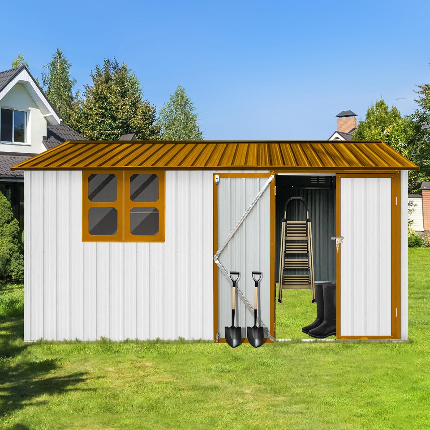 - ๐ก๐๐ง๐ข๐ช๐ฎ๐ ๐๐จ๐ซ๐๐ข๐ ๐๐๐ฌ๐ข๐ ๐ง: This 10x12 shed features a sloped gable roof that adds extra storage space, easily accommodating snow shovels, bicycles, a BBQ grill, trash bins, and gardening tools. The large metal storage building is equipped with a four-pane transparent window, not only providing a soft and comfortable light inside but also bringing a touch of fresh Nordic charm with its rustic, country-style design.