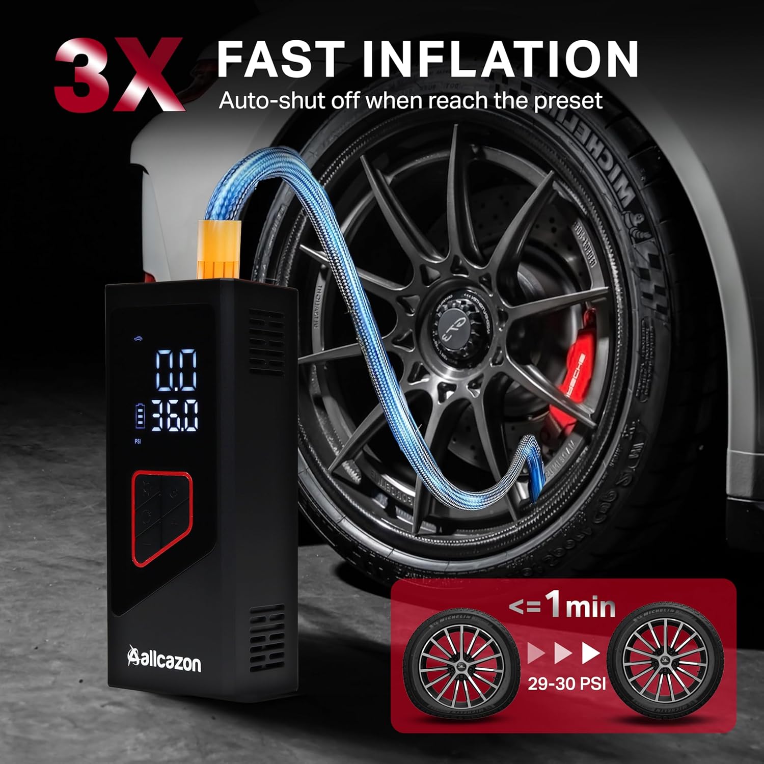 - Portable and Lightweight Design for Easy Storage: The ALLCAZON Tire Inflator Portable Air Compressor is designed to fit conveniently in your car trunk or glove box. This compact air compressor is perfect for car, motorcycle, and bike owners who need an emergency tool for quick tire inflation on the go. Great for car travel essentials and a must-have accessory for car, truck, and motorcycle trips.