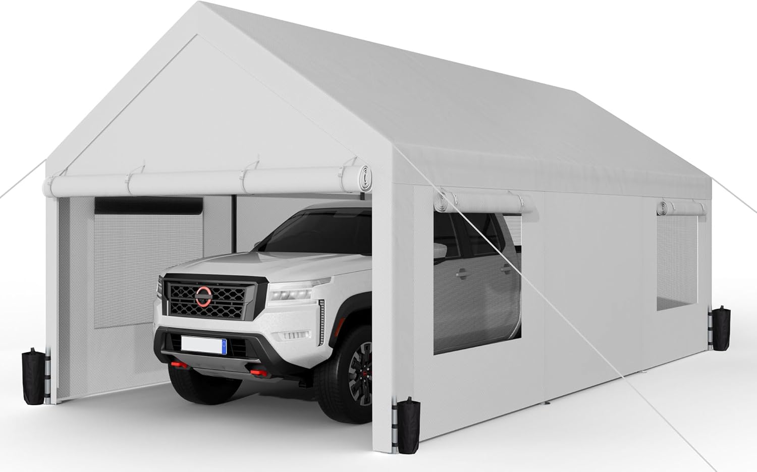 - 【Removable Side Walls & Ventilation Windows】: The roof of our carport is designed with 4 ventilation Windows on the side walls for optimal airflow throughout the year. The outer curtain can be rolled up or lowered according to the season and climate. At the same time, the four walls of the carport can be removed according to demand, which better creates space for the needs other than parking.