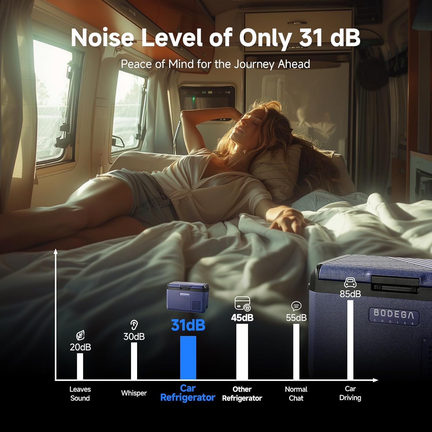 - 【Ultra-Quiet & Fast Cooling DC Compressor】 BODEGACOOLER Car Fridge Equipped with a high-efficiency DC compressor and professional vibration damping technology, operates at just 31 dB (library-quiet). Chill drinks in 15 mins with high-efficiency tech! (-4°F~68°F) Wide temperature range adapts as a portable freezer (frozen goods) or cooler (meal prep)—ideal for road trips or tailgating.
