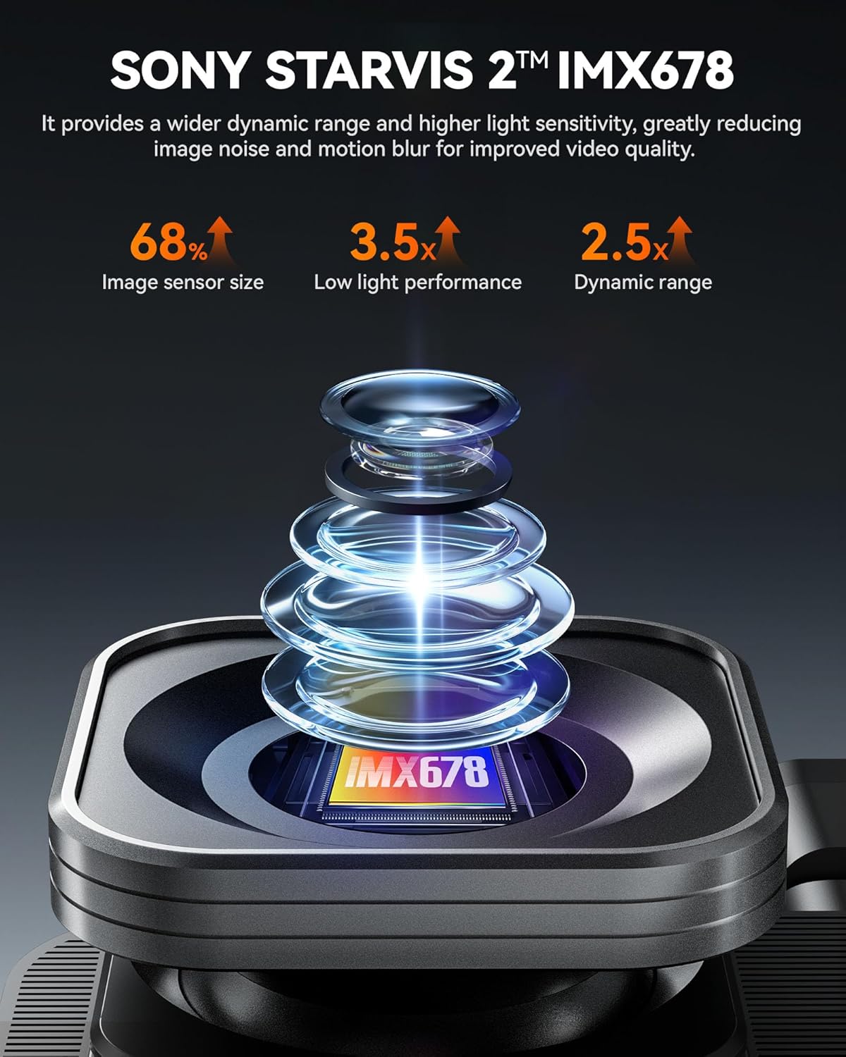 - [Upgraded Night Vision] Thanks to the STARVIS 2 IMX678 image sensor, the WOLFBOX X5 dashcams for cars ensure clear and detailed visuals even in low-light conditions. The dash cams combine advanced digital signal transmission technology to replace traditional analog transmission. Its strong anti-interference ability can provide excellent image quality and faster and more accurate data transmission, ensuring users' safe driving.