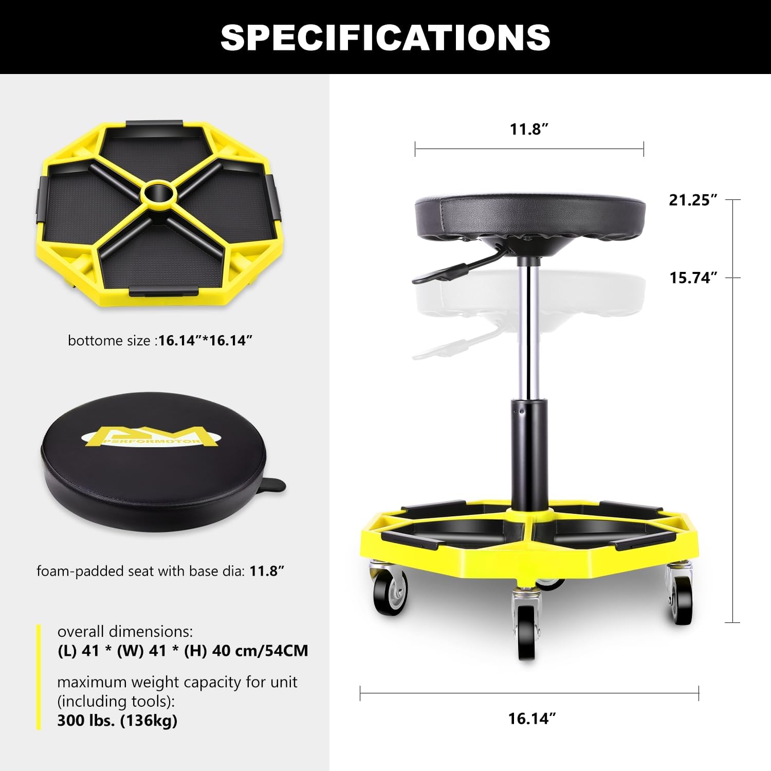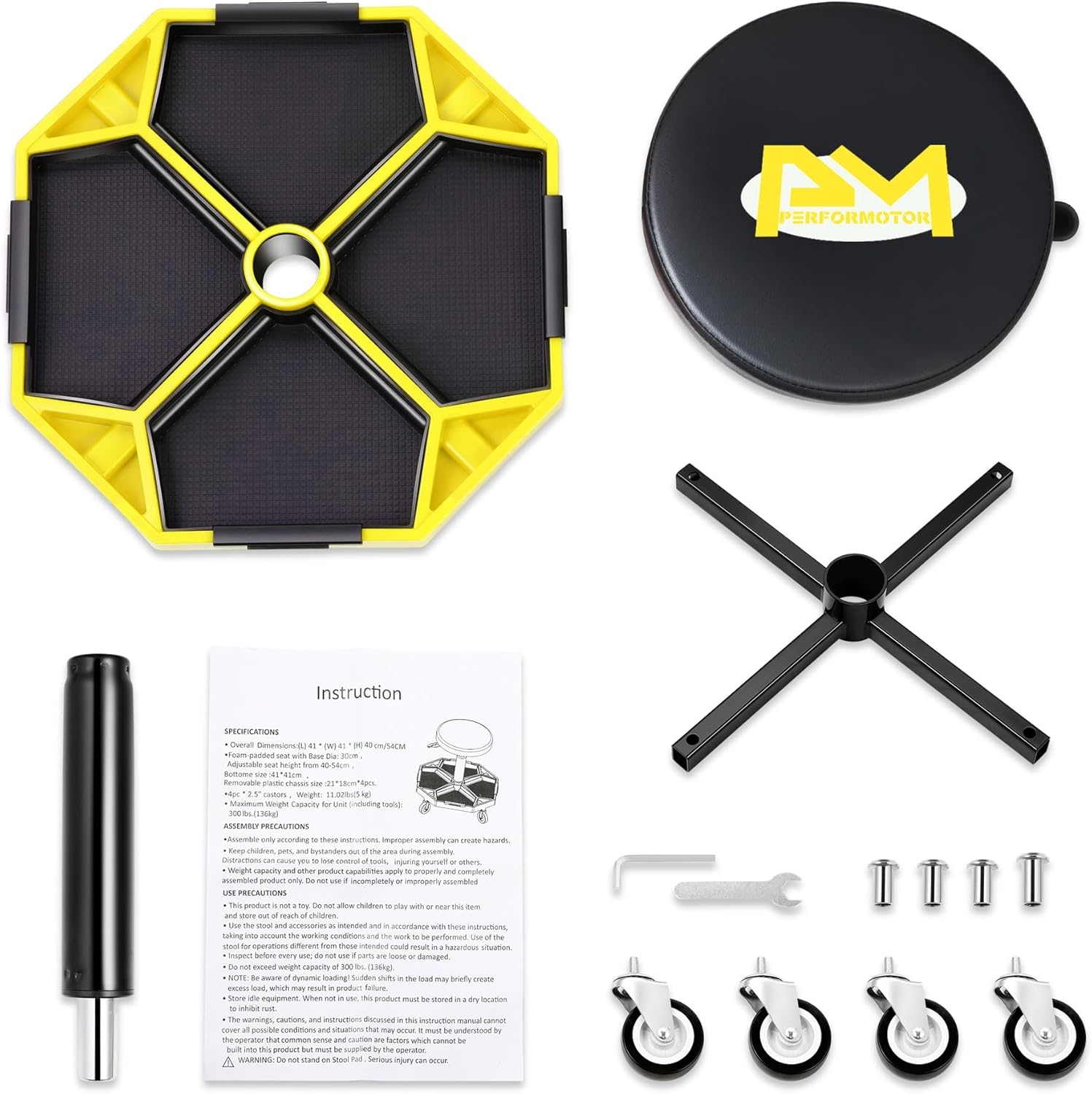 PM PERFORMOTOR Adjustable Height Pneumatic Garage Seat Rolling Mechanic Stool with Tool Tray Storage,300lbs Max Weight Capacity, Yellow,PM-TOL-ATS-YL