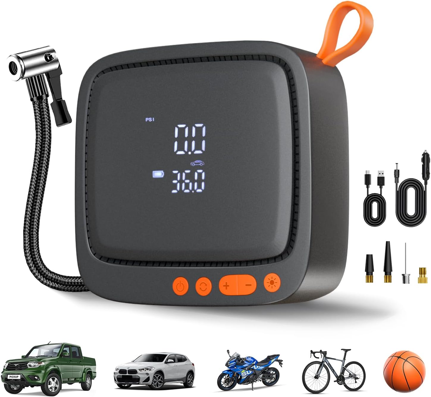 - 1 YEAR WARRANTY: Package Includes: 1* Baiikforza AP22 Car Tire Inflator with Quick-Connect Connector, 1*12V DC Cigarette Lighter (9.8 feet), 1*Air Hose, 1*Ball Needle, 1*Schrader-Presta Valve 2*Air Nozzles, 1* USB-C Charging Cable (5V 2A), 1* User Manual, 1 Year Warranty, lifetime customer service. NOTE: Can NOT be powered by an AC wall plug. Avoid placing this tool in flammable surroundings. Any questions or concerns, reach us directly via support at baiikforzatech dot co m.