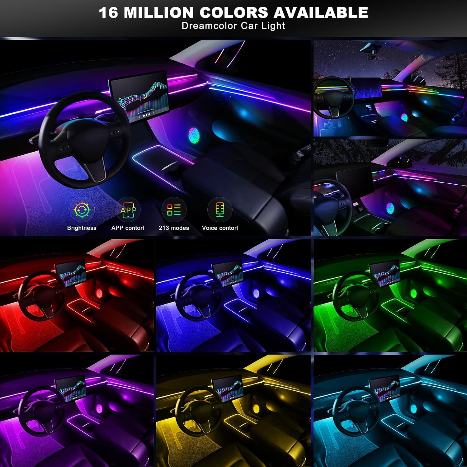 - 【High Bright & Uniform】The Dream+color Acrylic LED Car Ambient Interior Lighting have super bright LED and acrylic lens and contains 6 LED strips (4*29.5inch+1*43.3inch+1*14inch), Foot well lamp*4(44.5inch*2/64.9inch*2) and Door handle light*4+doors storage box light*4 (21.6+21.6inch)+Door horn light*4(5.9inch+ line 19inch*1),also comes with 1 main controller and 4 sub controllers,and can be flexibly installed on any car by DIY without disorganized, which is plug and play, and this acrylic light evenly spread over the lamp strip is brighter, more uniform and softer than other optical fiber lamps that rely on only one LED.