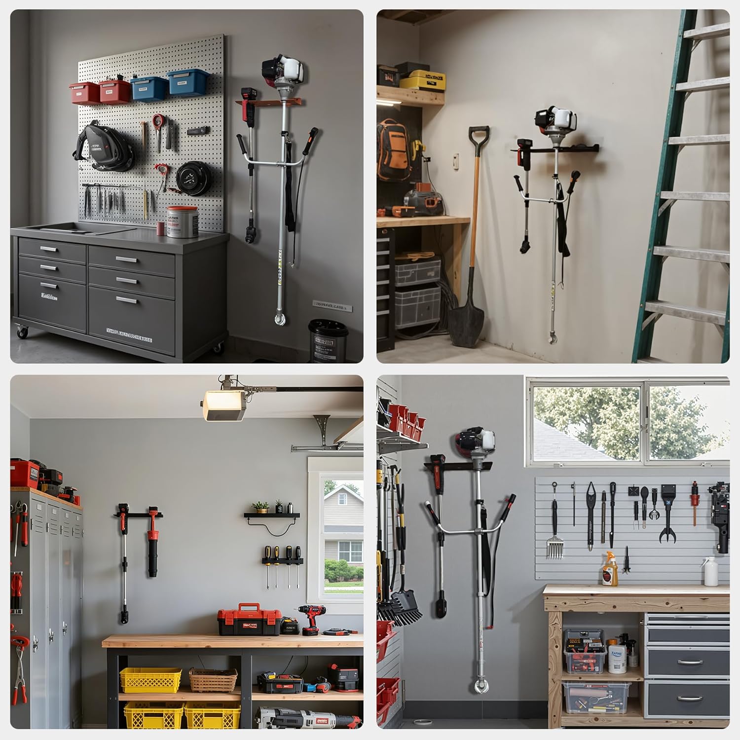 - Large Opening Weed Eater Rack: Smooth, flat panels with rounded edges prevent cuts and protect tools. The dual-slot design secures heavy items firmly, while rust-resistant, crack-proof materials ensure long-lasting durability