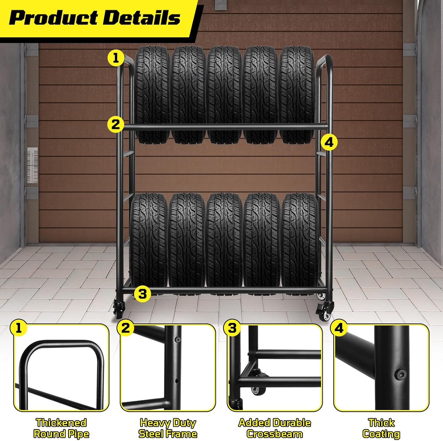 - Premium Quality Steel:The tire storage rack is made of cold-rolled steel plate, which has strong wear and corrosion resistance.The tire frame adopts a thick metal tube with a diameter of 4cm, which is structurally stable and firm without shaking.The maximum bearing capacity is 218KG/480LBS, and you can store your tires with confidence