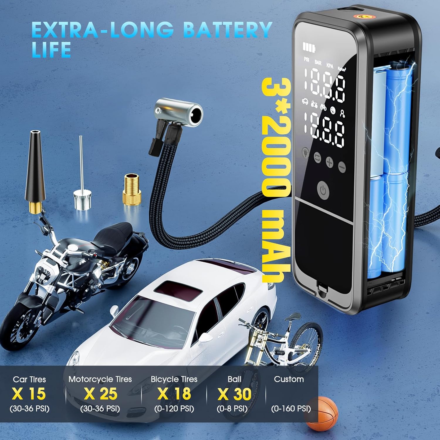 - [Fast Inflation] Portable tire inflator offers pressure up to 160 PSI and built-in 3 * 11.1V/2000mAh high-rate battery, can Inflate continuously for 20 minutes and quickly inflate your car tire(30-36 PSI) in less than a minute. The inflation speed is three times faster than that of the old inflator pump, it is a great solution for emergencies on the way. Specially designed for trucks, SUVs, motorcycles, bicycles and balls.