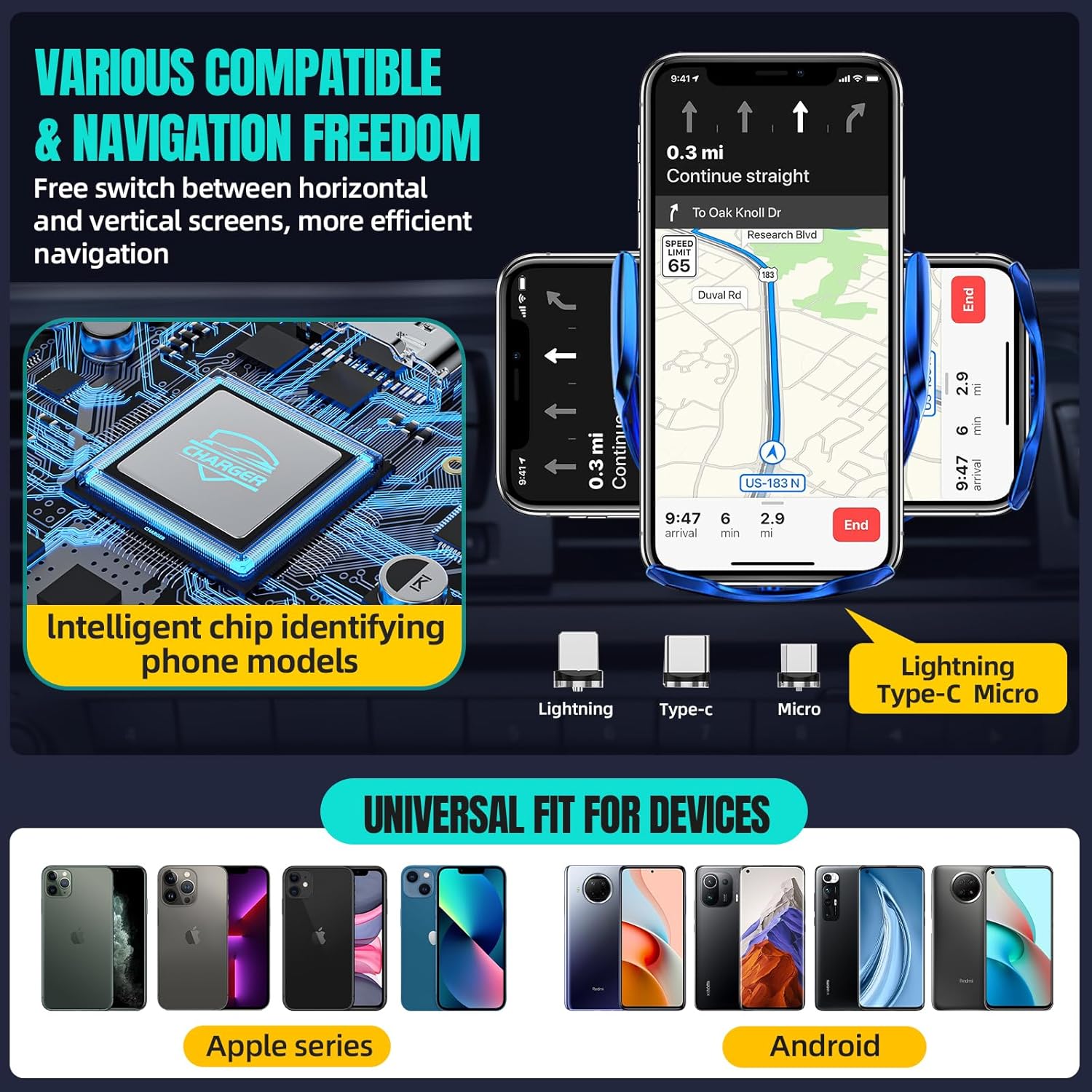 - 【Universal Compatibility and Dual Modes】Intelligent chip to identify various phone models, compatible with iPhone 16/15/14/13/12 Pro Max/Xs/X, Samsung Galaxy S24 Ultra/S23/S22/S21/S20/Note 20, Google, LG and other main stream smart phones. With dual mode by wireless charging and direct magnetic charging (with 3 magnetic connection head: Tpye-C, Lightening, Micro)