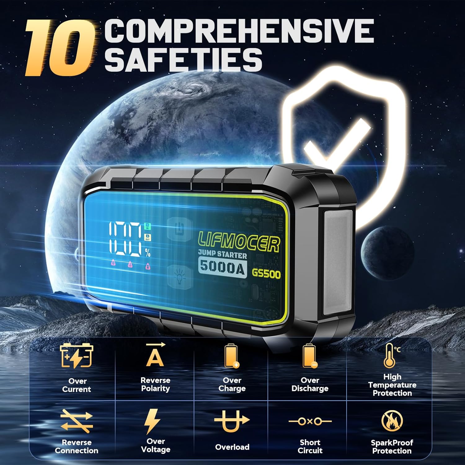 - 【LIFMOCER 5000A Jump Starter】When you have dead batteries on a road trip, you don't have to guess by the indicators anxiously or wait hours for AAA/someone for help on desolated interstates.With a powerful battery, This jump pack Can easily jump start (up to All gas or 10.0L diesel) 12v vehicles in 1-2 seconds