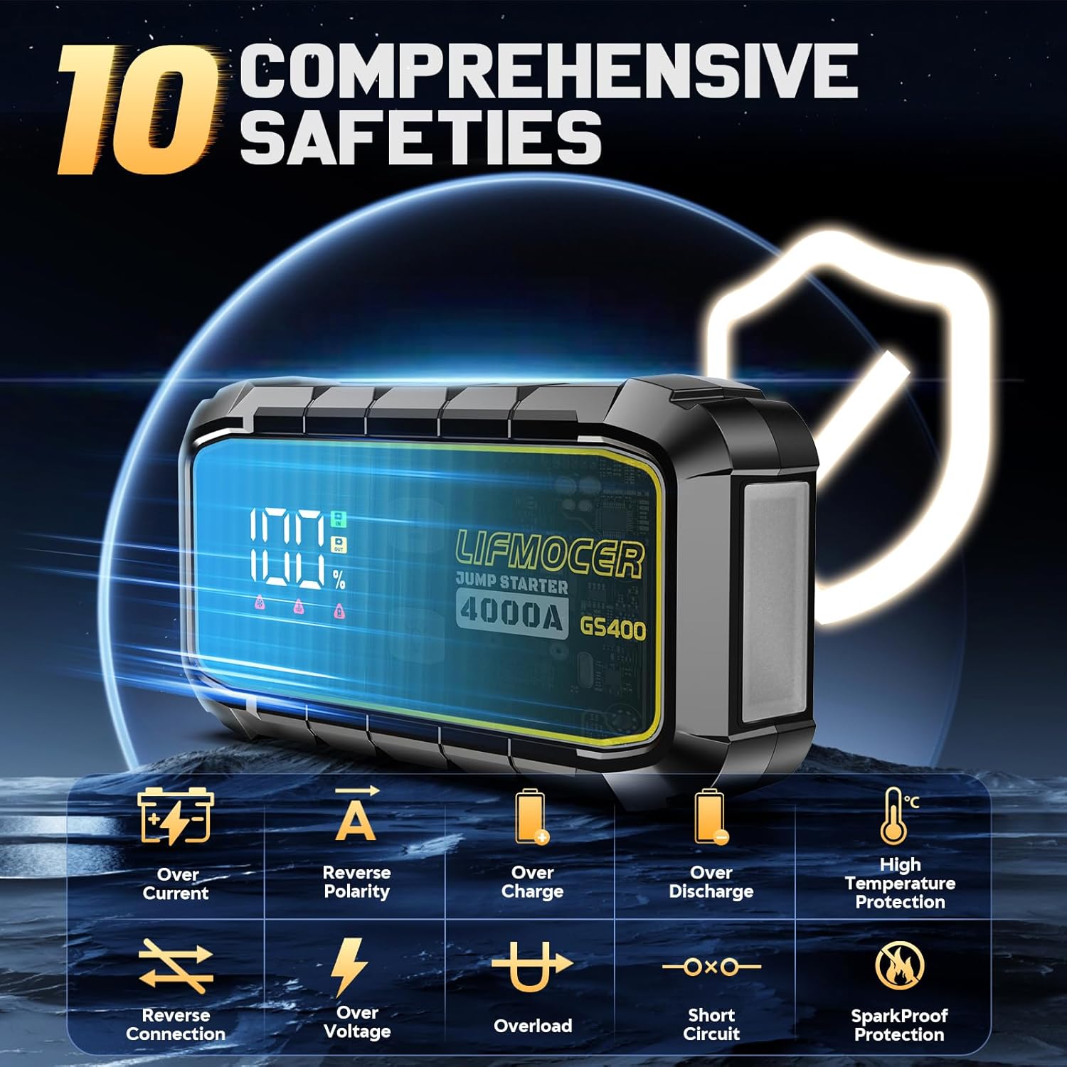 - 【Intelligent Secure Protection Design】Our battery jump starter built-in 10 types of protection, frees your worries of misuse and sparks. It comes with excellent conductivity and heavy-duty jump cables. We wanted to ensure our users feel 100% safe using our product