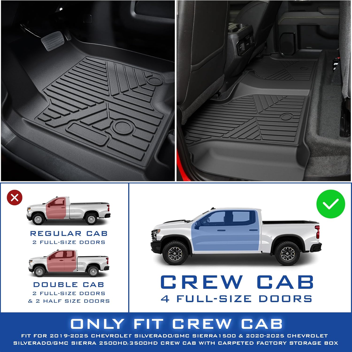 - 【CUSTOM FIT】Fit for 2025 2024 2023 2022 2021 2020 2019 Chevrolet Silverado 1500/GMC Sierra 1500&2020-2025 Chevrolet Silverado/GMC Sierra 2500HD/3500HD, advanced 3D scanning technology customized for Chevrolet Silverado and GMC Sierra. The Custom Fit TPE molding ensures seamless alignment with curves and edges, and the floor mats non-slip design ensures that it won't slide while driving.
