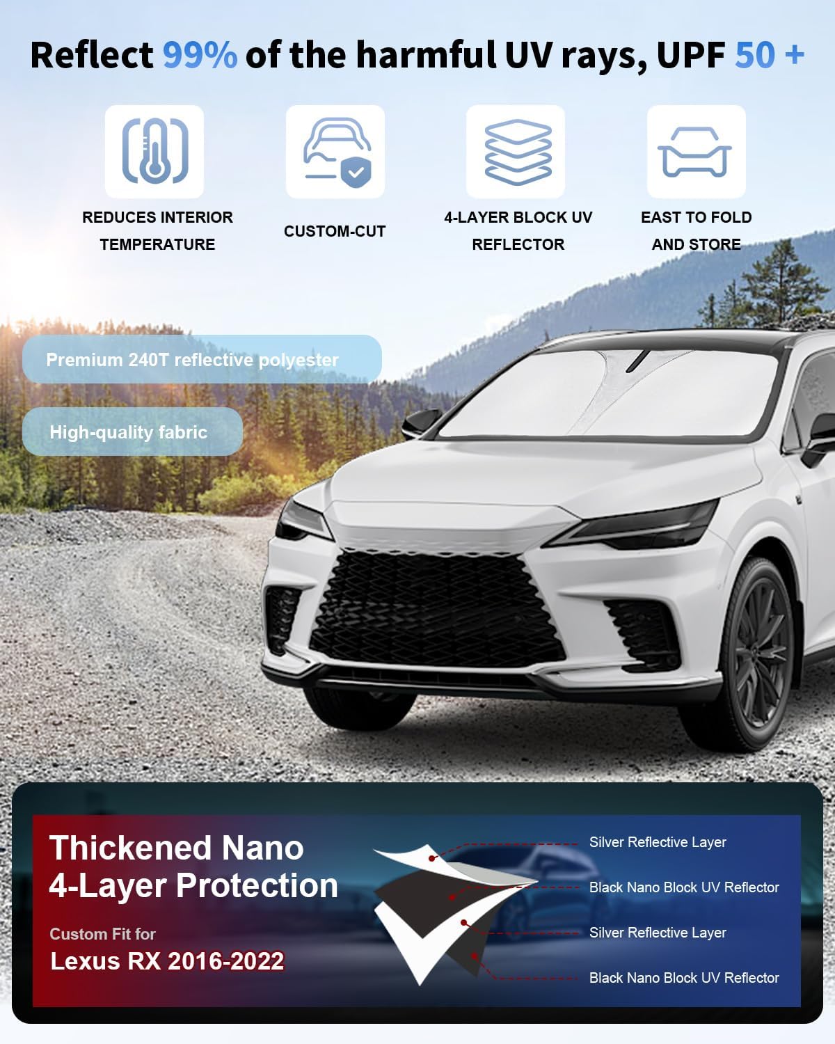 - [VEHICLE SPECIFIC] SLOGENTO Windshield Shade custom fit for Lexus RX 2016-2022 ,Full covered your windshield,No Gap,100% Perfect fit.