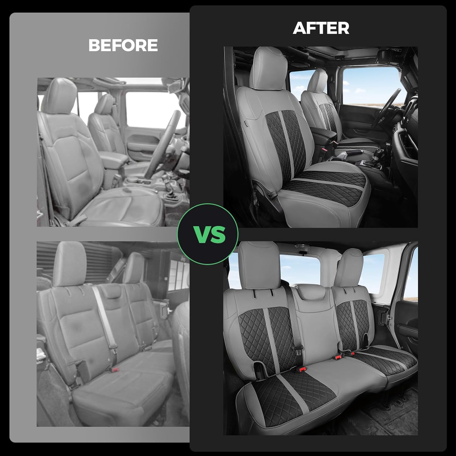for Jeep Wrangler Seat Covers 4Door JL 2018 2019 2020 2021 2022 2023 2024 2025, Custom Fit Car Seat Cover Full Set, Luxury Waterproof Leather Seat Protectors, Gray Black, W/O Rear Cup Holder