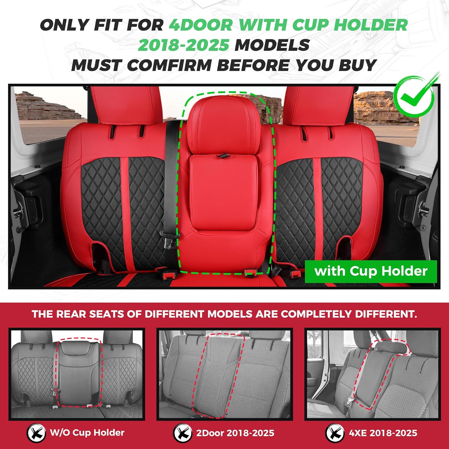 - 【Custom Car Seat Covers】: Precision cut and custom tailored to "2024 Wrangler Sport S 4DR SUV" for a glove-like fit. Exclusively designed for Jeep Wrangler Seat Covers 4Door 2018 2019 2020 2021 2022 2023 2024 2025 With Rear Cup Holder, since they have the same or similar seat size. (Not fit for Wrangler 4XE and 2 Door)
