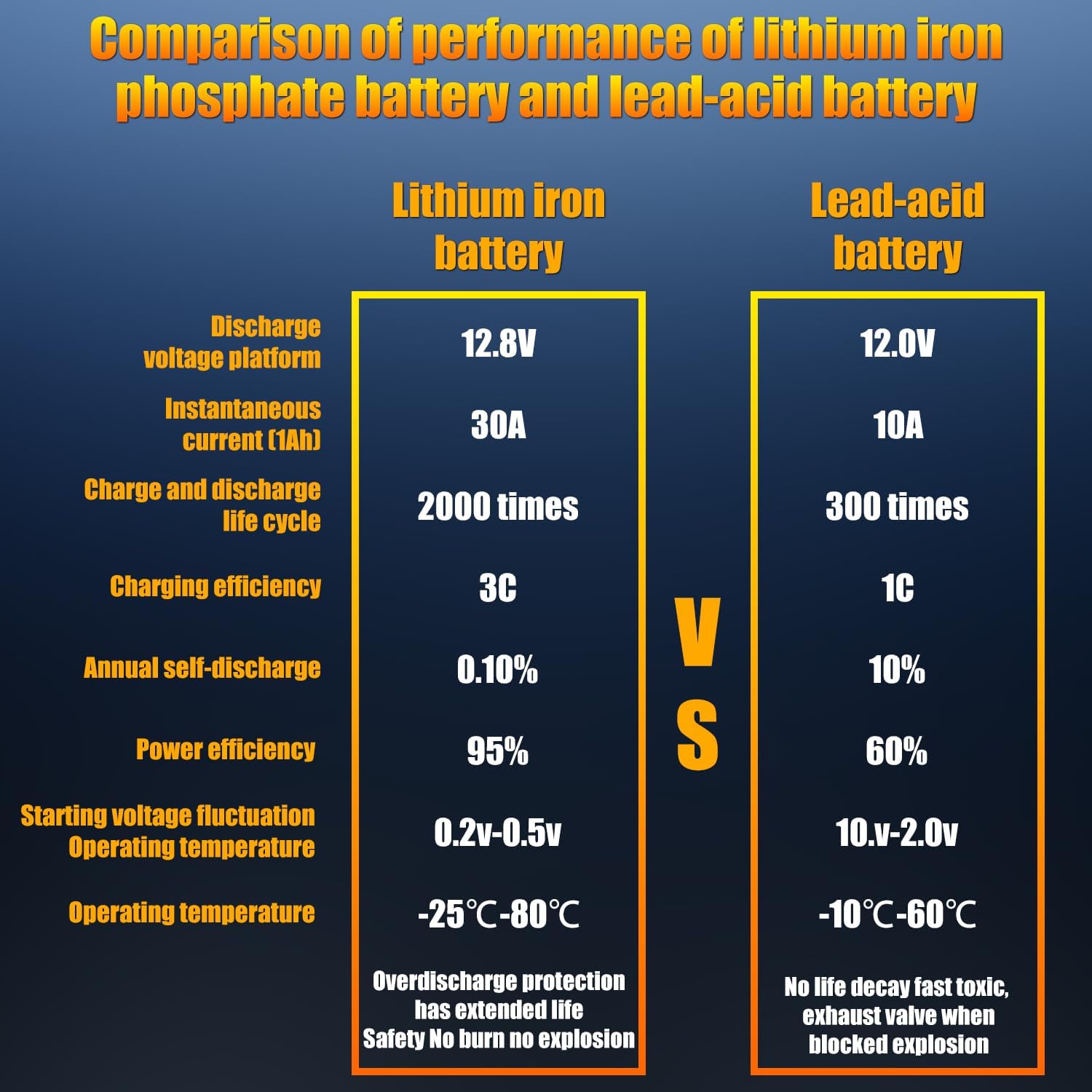 - Robust Performance: With high rate power imported lithium iron phosphate battery pack, our battery offers 1.5 times more starting power than ordinary batteries. It can withstand high temperature, extreme cold, and tough road conditions