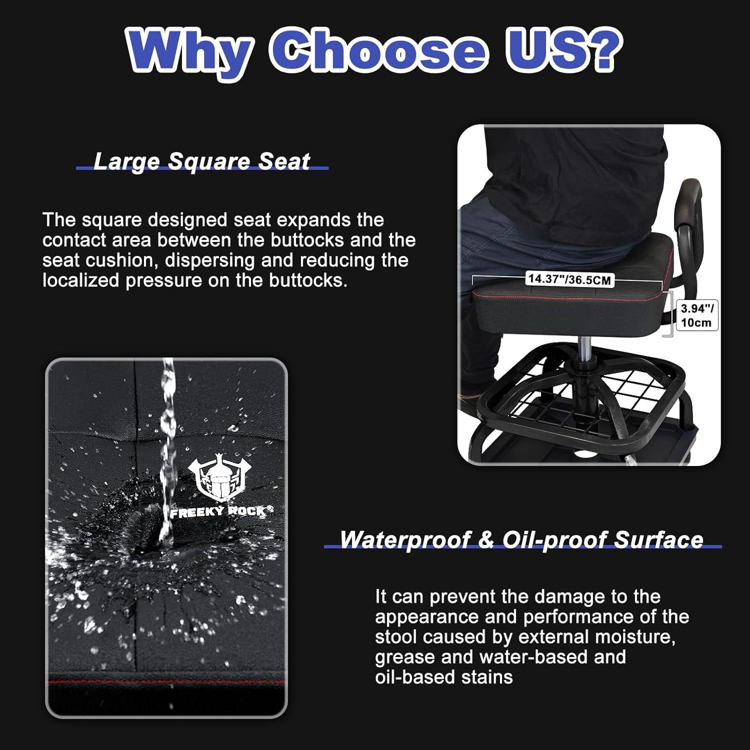 - 【Thickened Seat Cushion】14.37"/36.5CM Diameter Seat. 3.94"/10 CM height cushion. The thickened memory foam padded cushion seat is larger than other garage work stools. The cushion surface of stool is made of PVC material which is waterproof and oilproof, making it easy to be cleaned