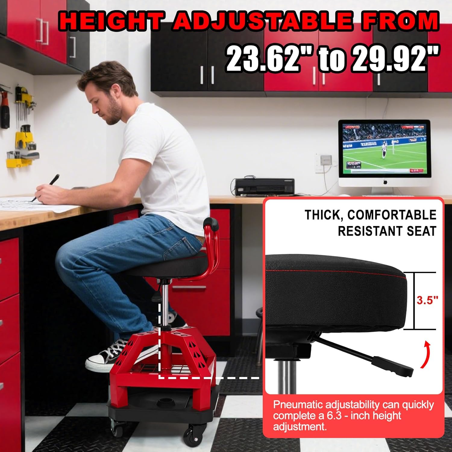 Rolling Shop Stool with Wheels, Heavy Duty Garage Work Mechanic Stool with Backrest, Adjustable Height 360°Swivel Rolling Chair with Tool Tray Storage, 330 LBS Capacity, Red