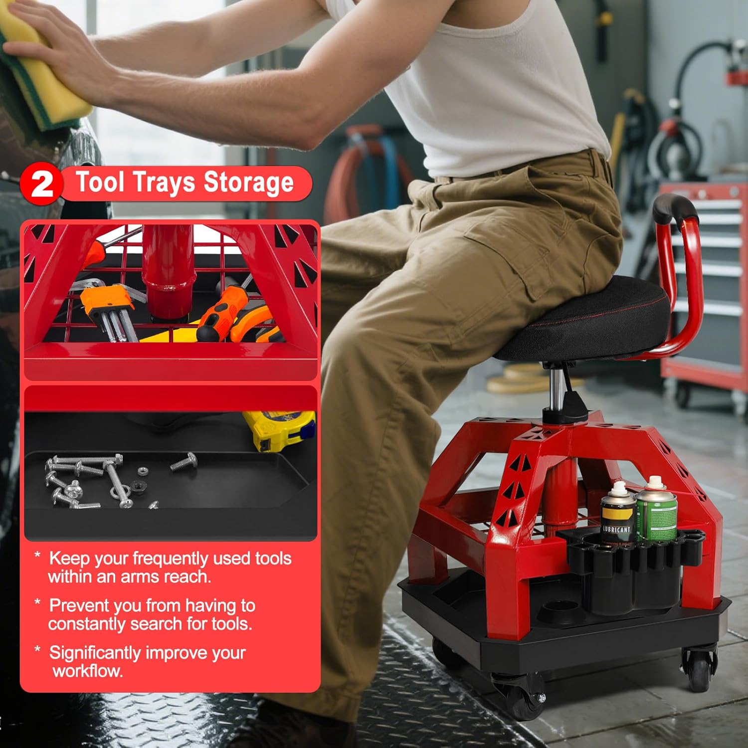 - The design of this automotive repair rolling chair includes two tool trays located under the seat. The first layer is a metal mesh tray, and the second layer is a solid plastic tray, making it convenient to store and access necessary tools and parts. In addition, we are also equipped with cup&tools holder, can store beverages, spray cans, screwdrivers and other tools.