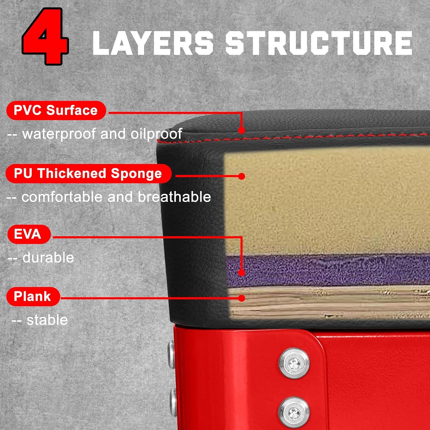 - Comfortable 4 Layers Structure Padded Seat : The Mechanic roller seat cushion is consists of 4 layers structure. The 1st layer is a solid wooden plank, the 2nd layer is a durable EVA, the 3rd layer is a comfortable and breathable PU thickened sponge, and the 4th layer is a waterproof and oilproof PVC surface. Plump and Soft Touch, Awsome Support, and Very Comfortable.