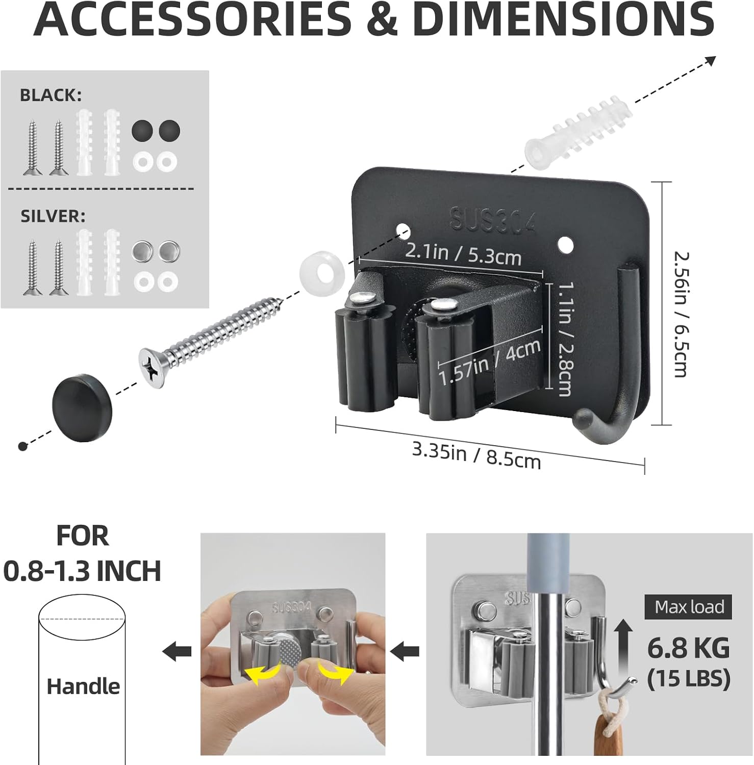 - đ§čăSize & AccessoriesăPlease note that this mop hanger is suitable for tools with a handle diameter between 0.8-1.3 inch. With the enlarged base (3.35*2.5 in) and back reinforced screws provide extra support. Each bracket paired with 2 screws, 2 anchors, 2 plastic rings & 2 decor caps. Drill Installation with screws ensures a safer fixation compared with adhesive.