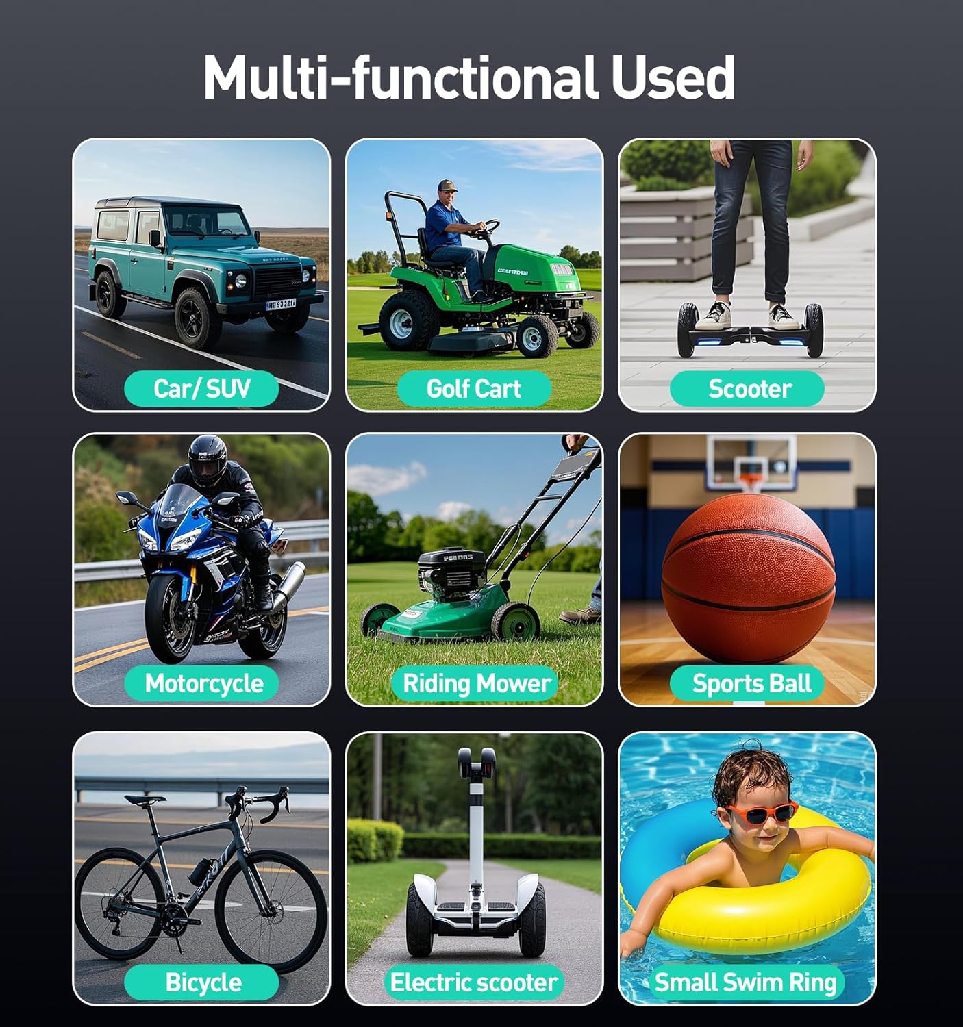 - 【Multi-scene&Multi-function】Teffim tire inflator has four valves, used as car motorcycle balls and bike pump. Provides two infalte modes: 12V DC and battery supply. When it out of power, inflated directly using vehicle power. Essential car accessories for all kinds of emergencies.