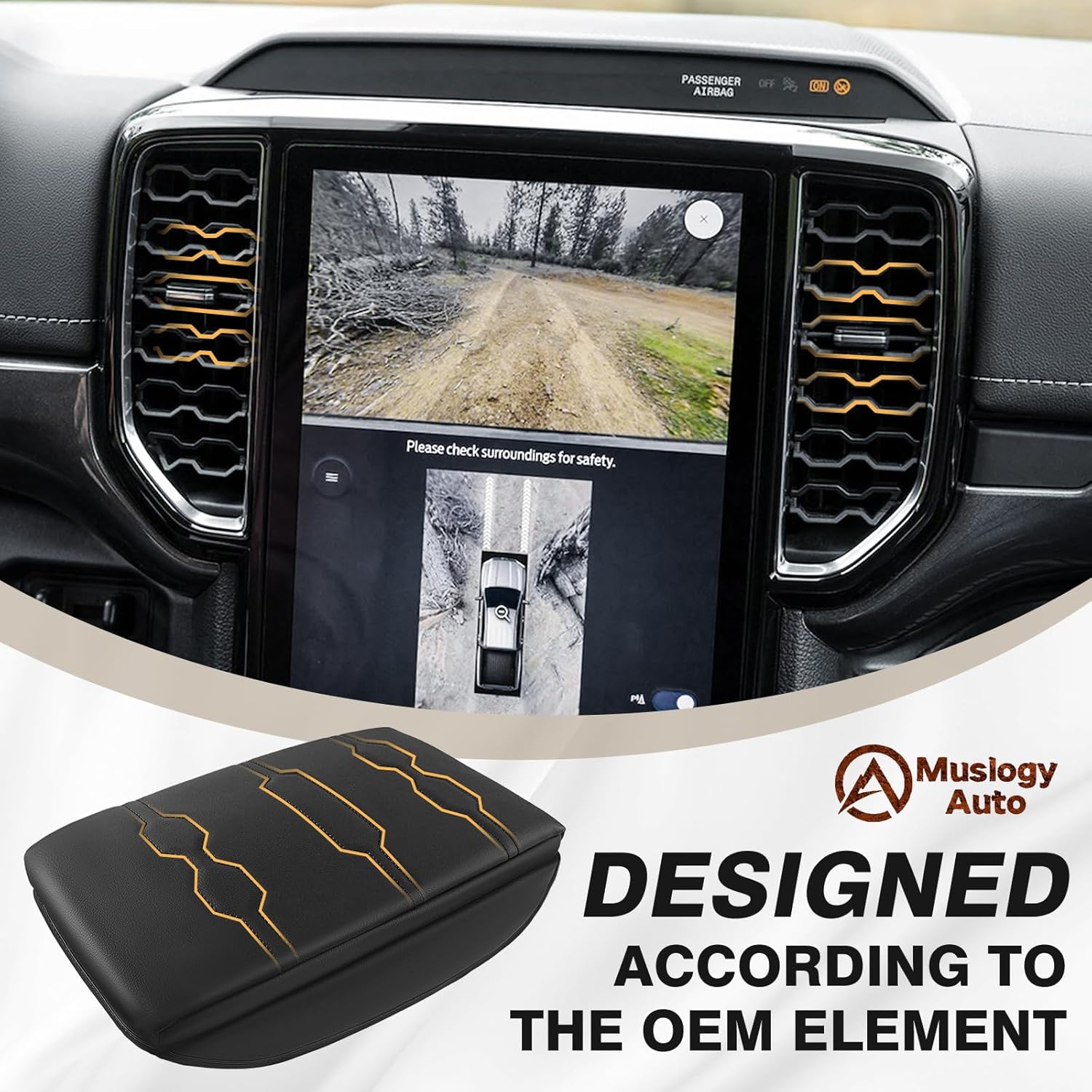Muslogy Center Console Armrest Cover Compatible with Ford Ranger 2024 2025 Accessories Comfort Armrest Pad Cushion Box Lid Cover Vegan Leather Protector 1-Inch Extra Thick(Black/Black Stitching)