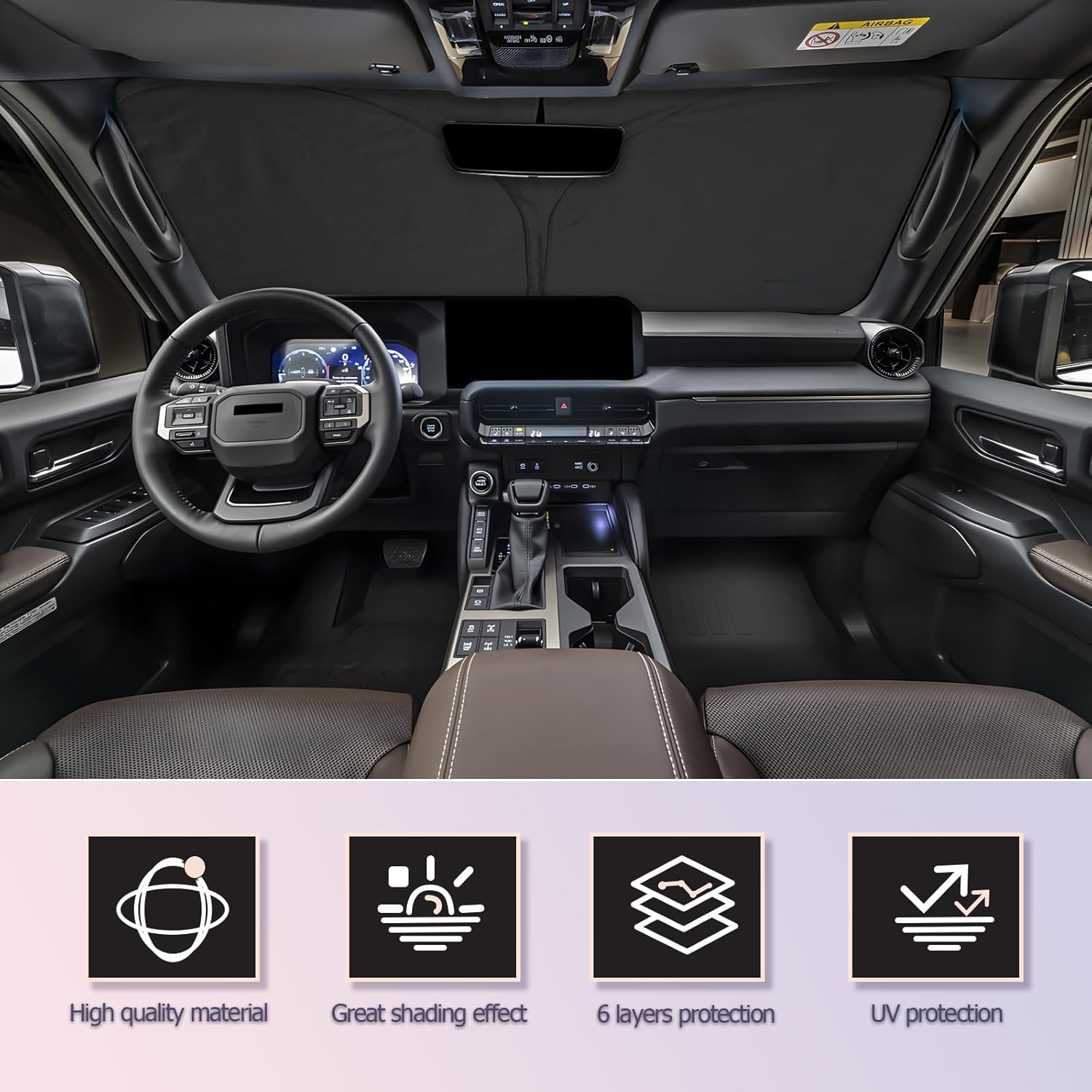 - 【Premium Protection】The 2025 LC250 Prado J250 Land Cruiser windshield sunshade keeps your car internal relatively cool, effectively blocks sunlight, prevents harmful UV rays and heat from entering the car, and does not expose the steering wheel to strong sunlight for a long time, which can burn your hands. It can also protect car leather seats, instrument panels, display electronics, air outlets, etc. make them will not fade, crack, or fail