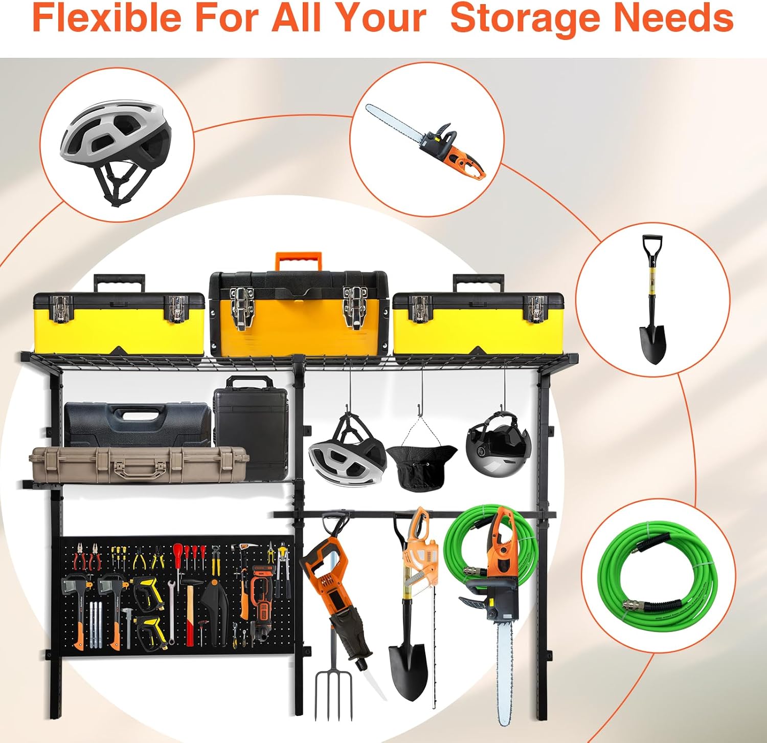 - ๐๐๐ฃ๐ฎ๐ฌ๐ญ๐๐๐ฅ๐ ๐๐๐ฏ๐๐ฅ๐ฌ: Customize shelves and pegboard hooks to fit shovels, rakes, hoses, cords, bags, sprayers, spreaders, buckets, aprons, hats, and more, adapting to your growing storage needs. Our adjustable storage solution organizes almost any tool with perfectly sized spacing.