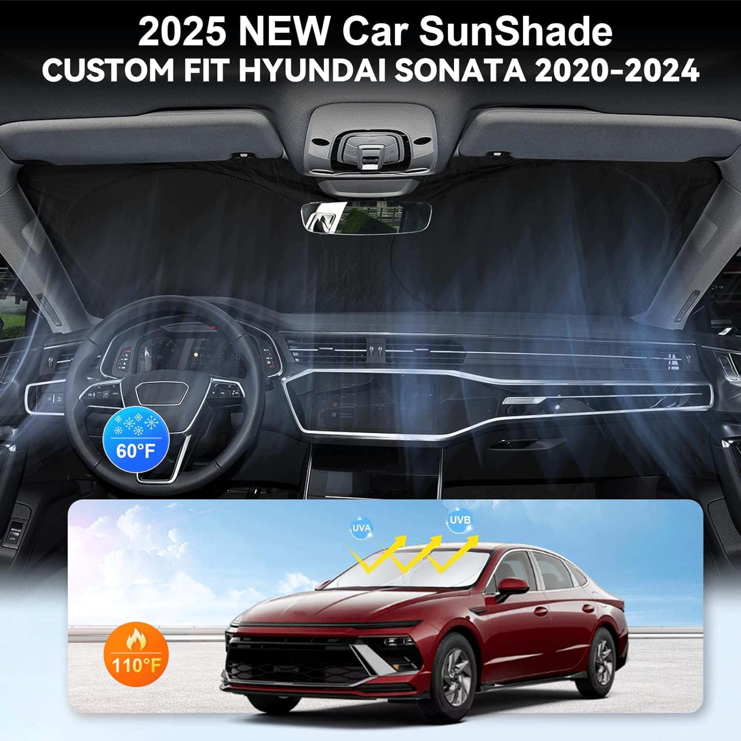 - [CUSTOM-FIT FRONT WINDSHIELD SUNSHADE] Automotive windshield sun shade is Specifically designed,which for 2020-2024 2025 Hyundai Sonata accessories. We have several size of car sunshade. Please measure your car size and refer to our size before your purchase. Once installed it won't have gaps, sags or slumps like other car sun shade windshield