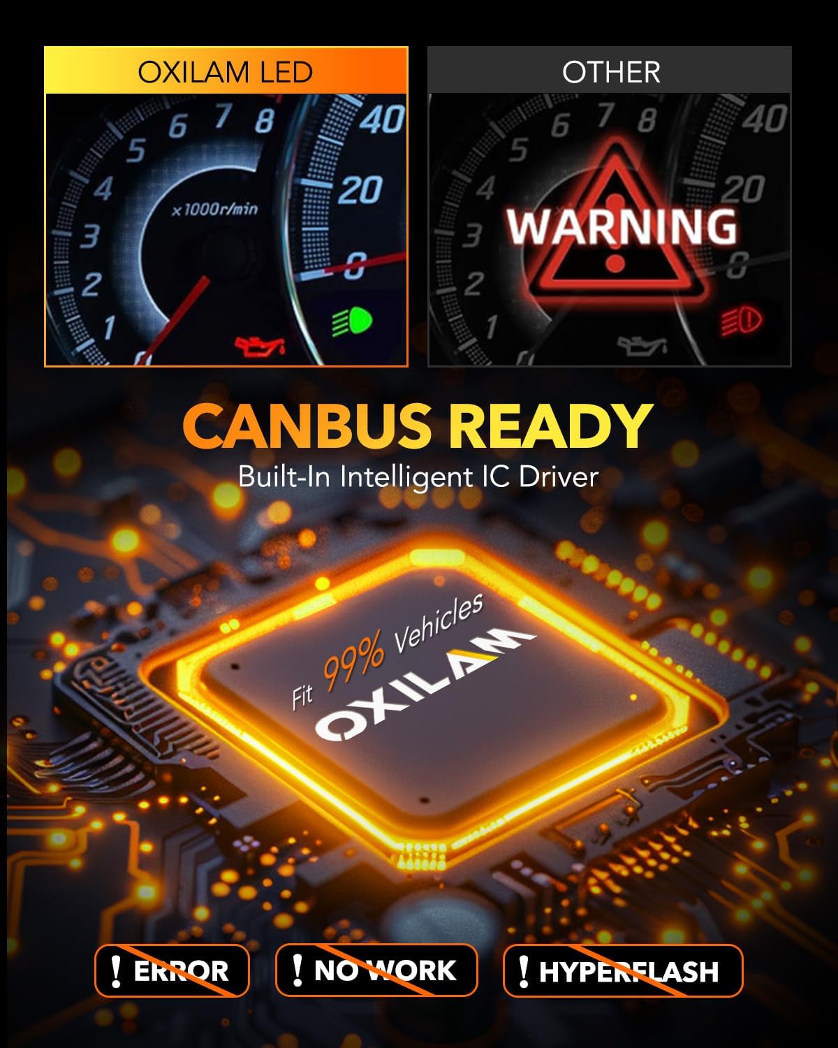 - 【Compatible with 99% of Vehicles】OXILAM HB4 LED bulbs are equipped with an intelligent IC driver, ensuring compatibility with 99% of vehicle systems for flicker-free and error-free operation. For sensitive models requiring additional decoders, our team is ready to assist. Before purchasing, confirm compatibility using the user manual or bulb size reference.