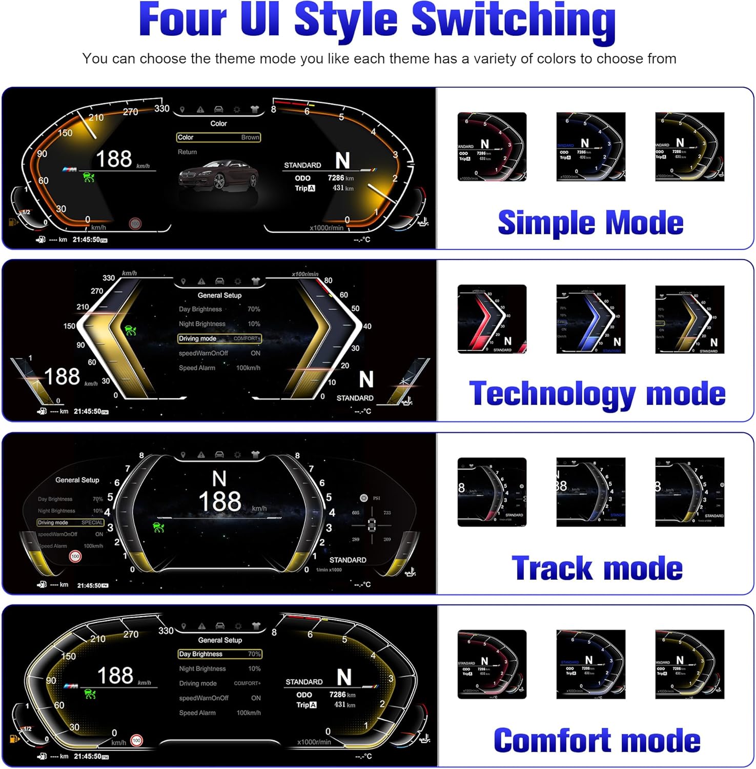 - ✔️[4 sets of UI styles can be freely switched] This digital cluster features 4 customized modes (simple, comfortable, track, and technology) for the LCD. Additionally, it offers 4 color interfaces (red, purple, blue, and orange) that can be freely changed to enhance your driving comfort. The original vehicle data and information are presented more intuitively