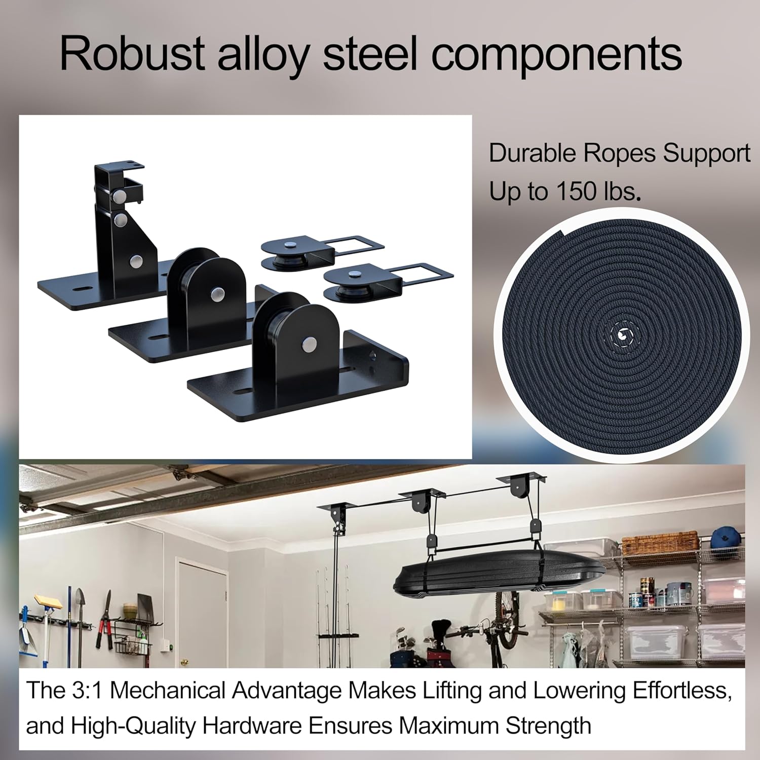 - DURABLE AND USER FRIENDLY: Our garage storage hoist is constructed from robust steel and high-strength rope, designed to safely support weights of up to 150 pounds. Pulley hoist system comes equipped with two ropes: one 20 meters and the other 10 meters. The mechanical advantage of the storage hoist system makes lifting heavy items easier and less strenuous, ensuring that you can manage your gear with minimal effort.