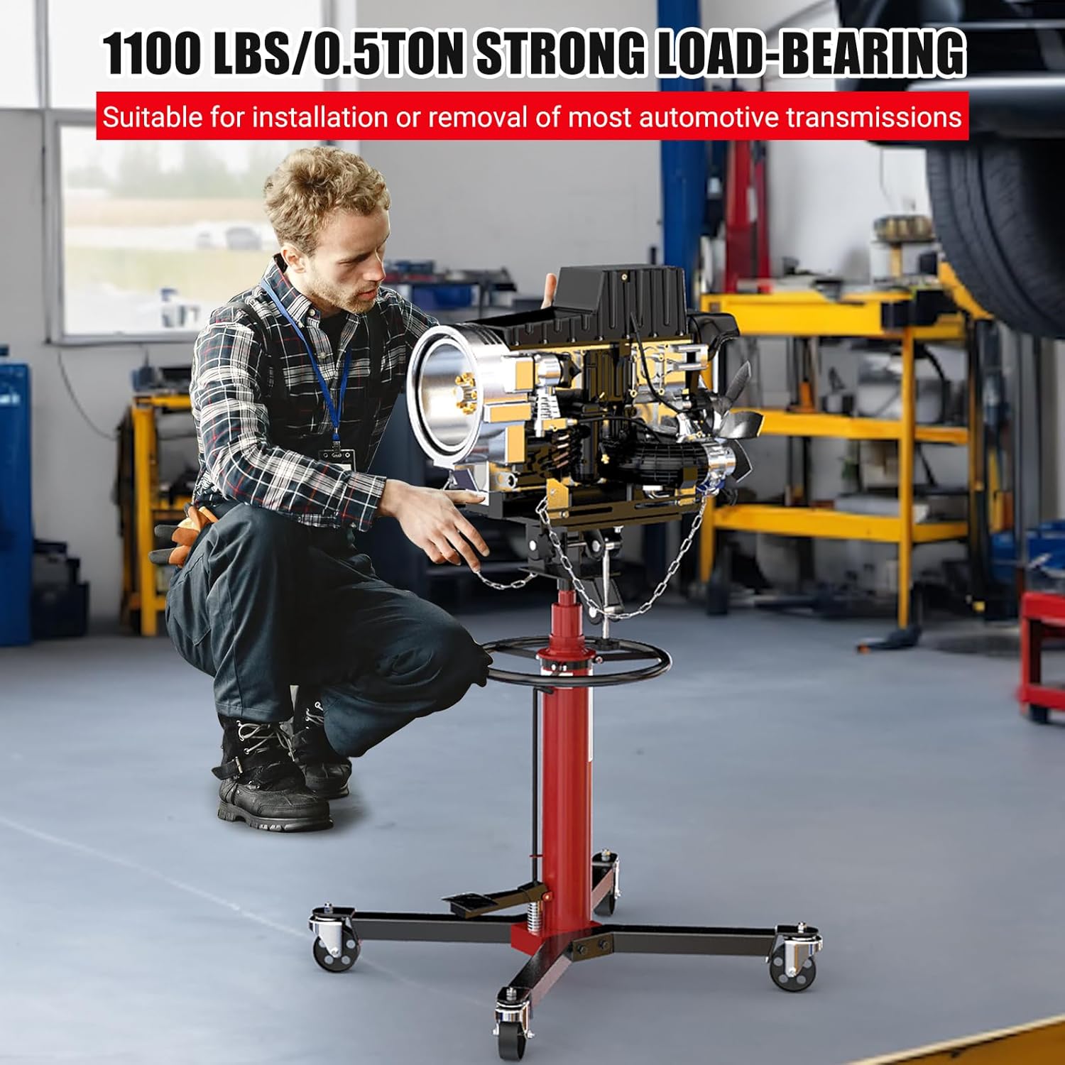 - 1100 LBS LOADING CAPACITY: Our 1100 lbs(1/2 ton) hydraulic telescoping transmission jack helps you easily guide a transmission securely. Great for any automotive or light truck transmission installation or removal. See where the problem is and solve it with a quality transmission jack.