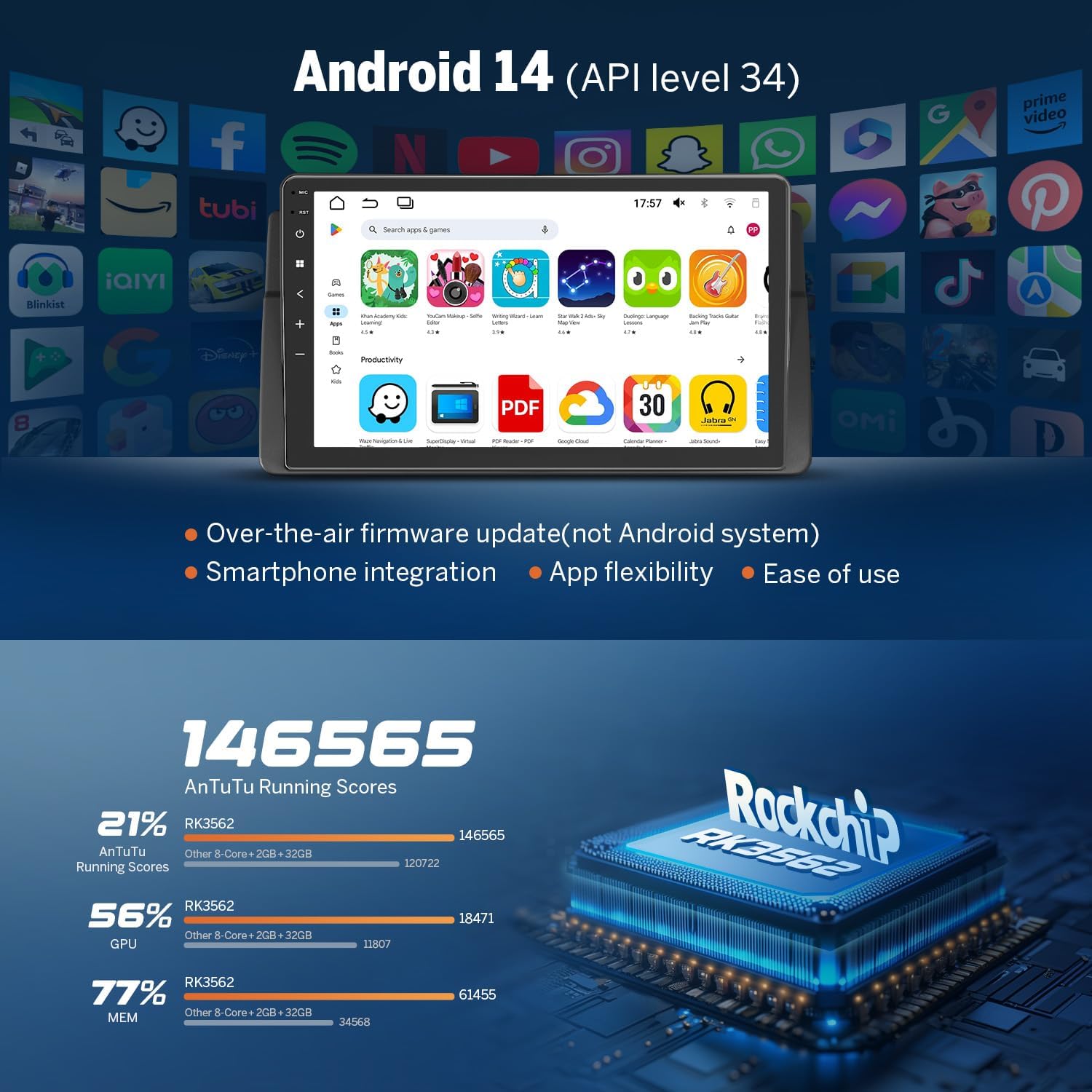 - 【Newest Android 14 System】Built-in with the latest Android 14 system and 3GB RAM+32GB ROM, paired with a cutting-edge Rockchip processor for superior performance and energy efficiency, the E46X7 car stereo outperforms conventional other car stereo with 8-core processors. Eonon offers convenient online firmware updates, you don't need a USB stick to upgrade.